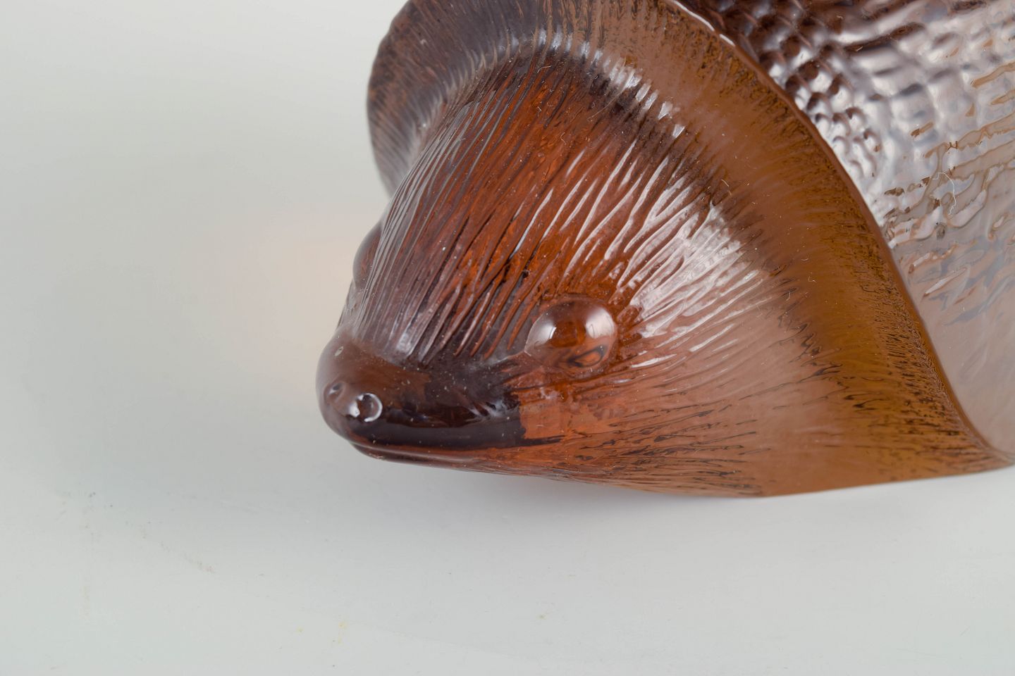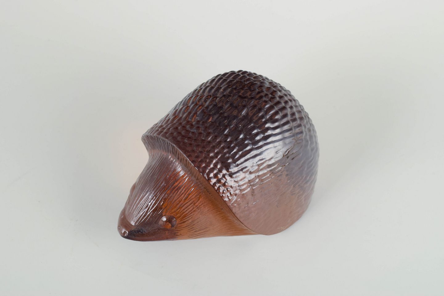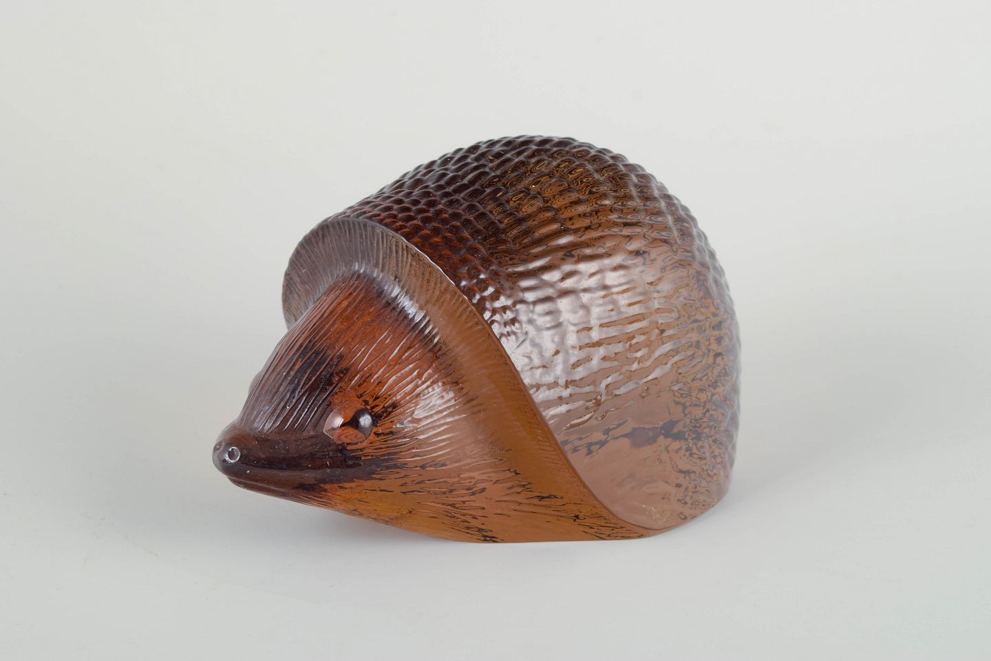 Glasfigur af pindsvin i ravfarvet glas, 1970’erne.