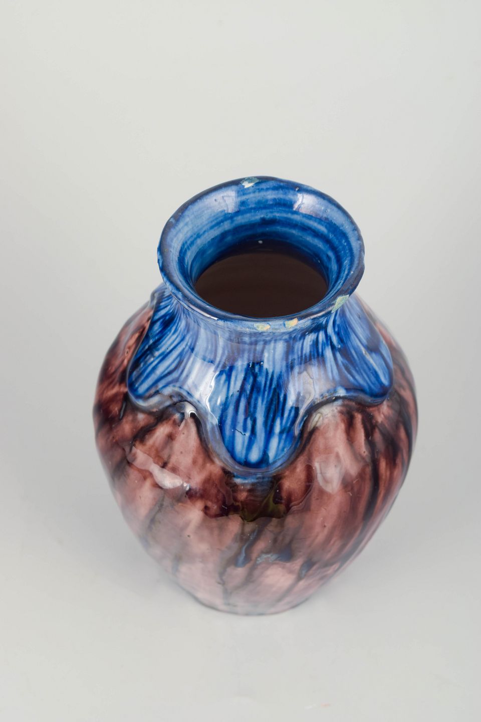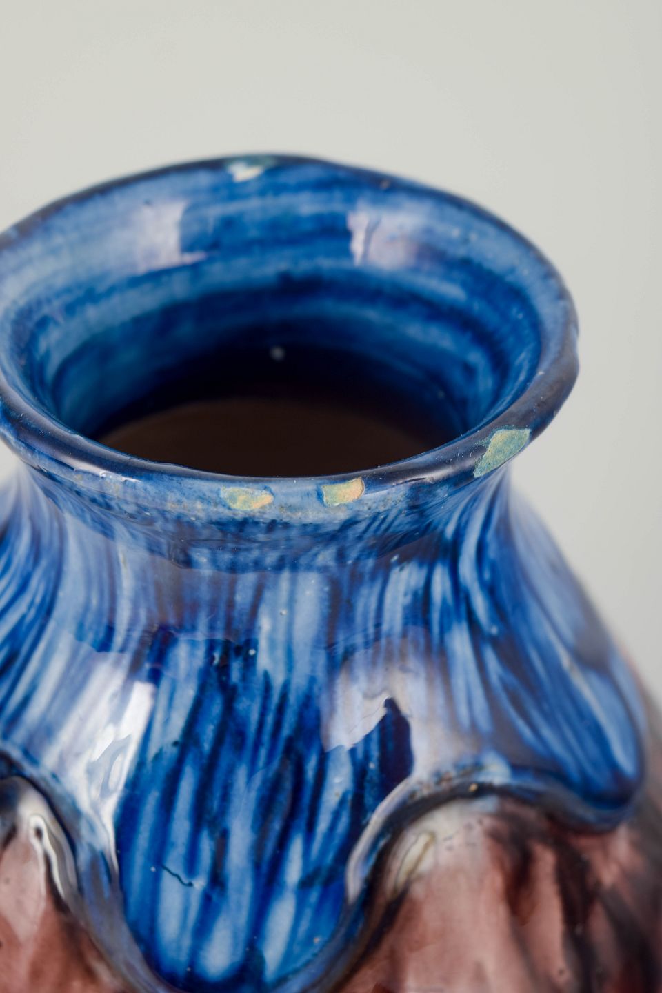 Håndformet stentøjsvase med blød buet krop og levende flammet glasur i dyb brun med flydende blå top og lodrette penselstrøg i jugendpræget udtryk. Unikt håndlavet værk.