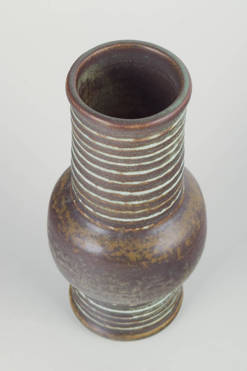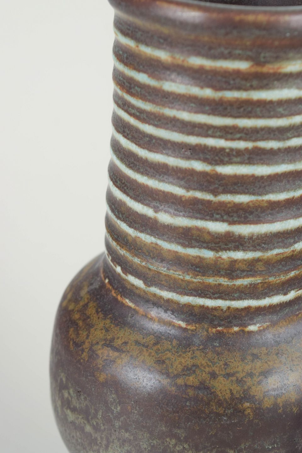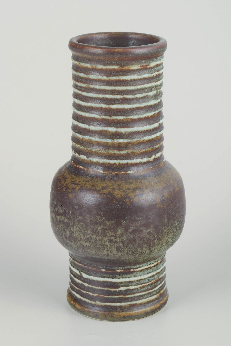 Karakteristisk cylindrisk form med svungen midtersektion og horisontale indskårne striber i lys glasur mod dyb brun-grøn bundglasur — et klassisk eksempel fra Nylunds eksperimenterende Igloo-serie.
