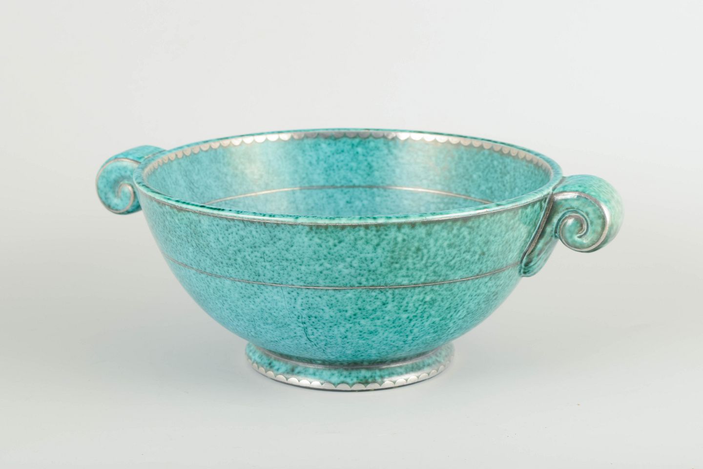 Stentøj med turkis glasur og indlagte sølvdekorationer, udvendigt dekoreret med håndindridset kvindefigur og stiliseret grenmotiv. Svungne dobbelthanke i klassisk art deco-stil.
