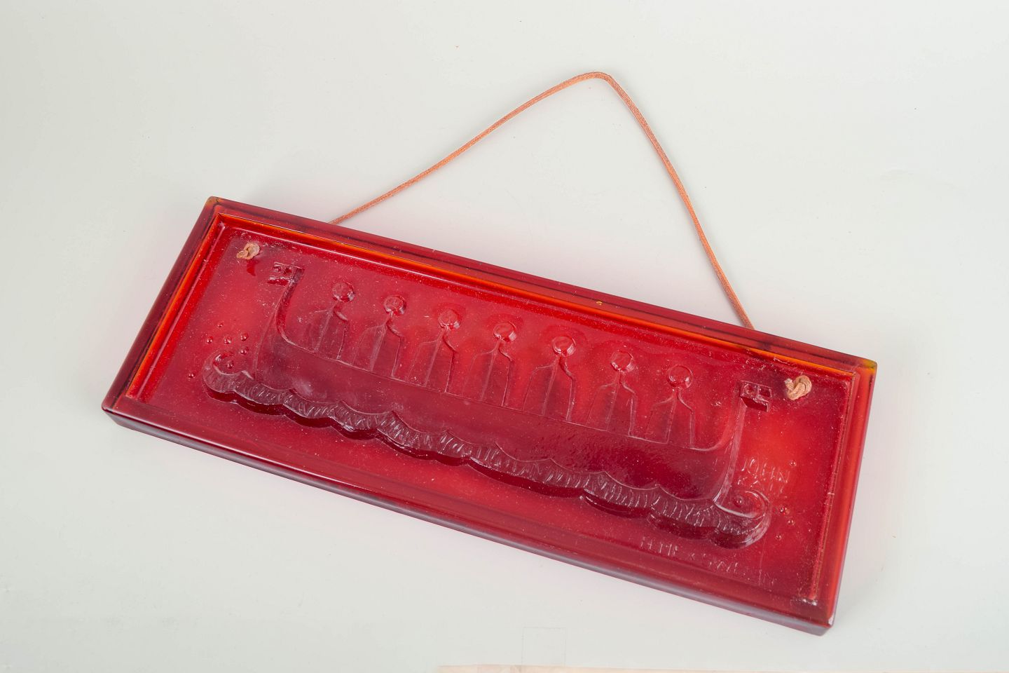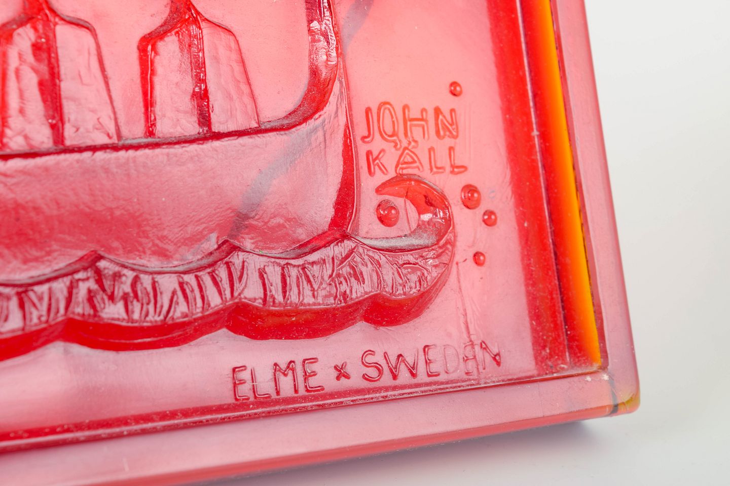 Rektangulært væghængt relief i dyb rød/orange glasmasse, signeret John Käll i formen og mærket ELME SWEDEN. Stiliseret vikingeskib med besætning i procession og bølgende havmotiv.