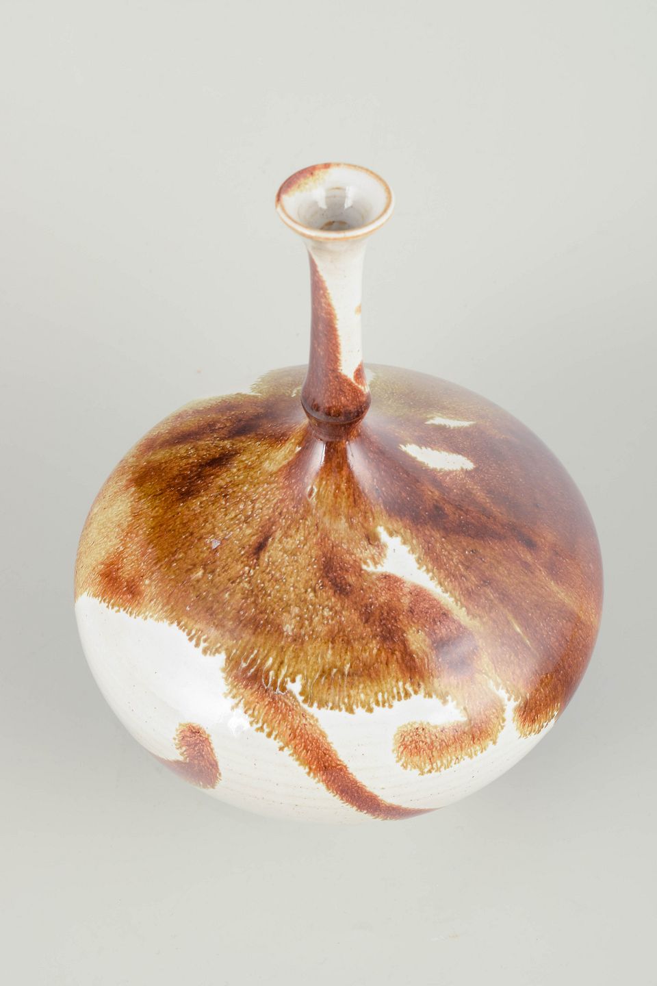 Hånddrejet stentøjsvase med høj slank hals og organiske brune glasurløb over råhvid bund. Unika vase, signeret af kunstneren.