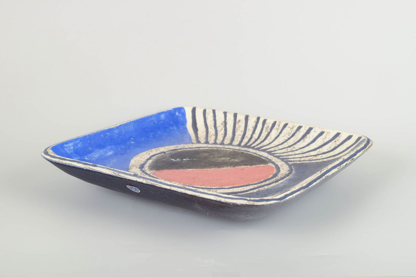 Rektangulær skål i stentøj med hånddekoreret konkret/geometrisk motiv i blå, sort, rød og hvid glasur. Let svungne kanter og lav kuvet form.