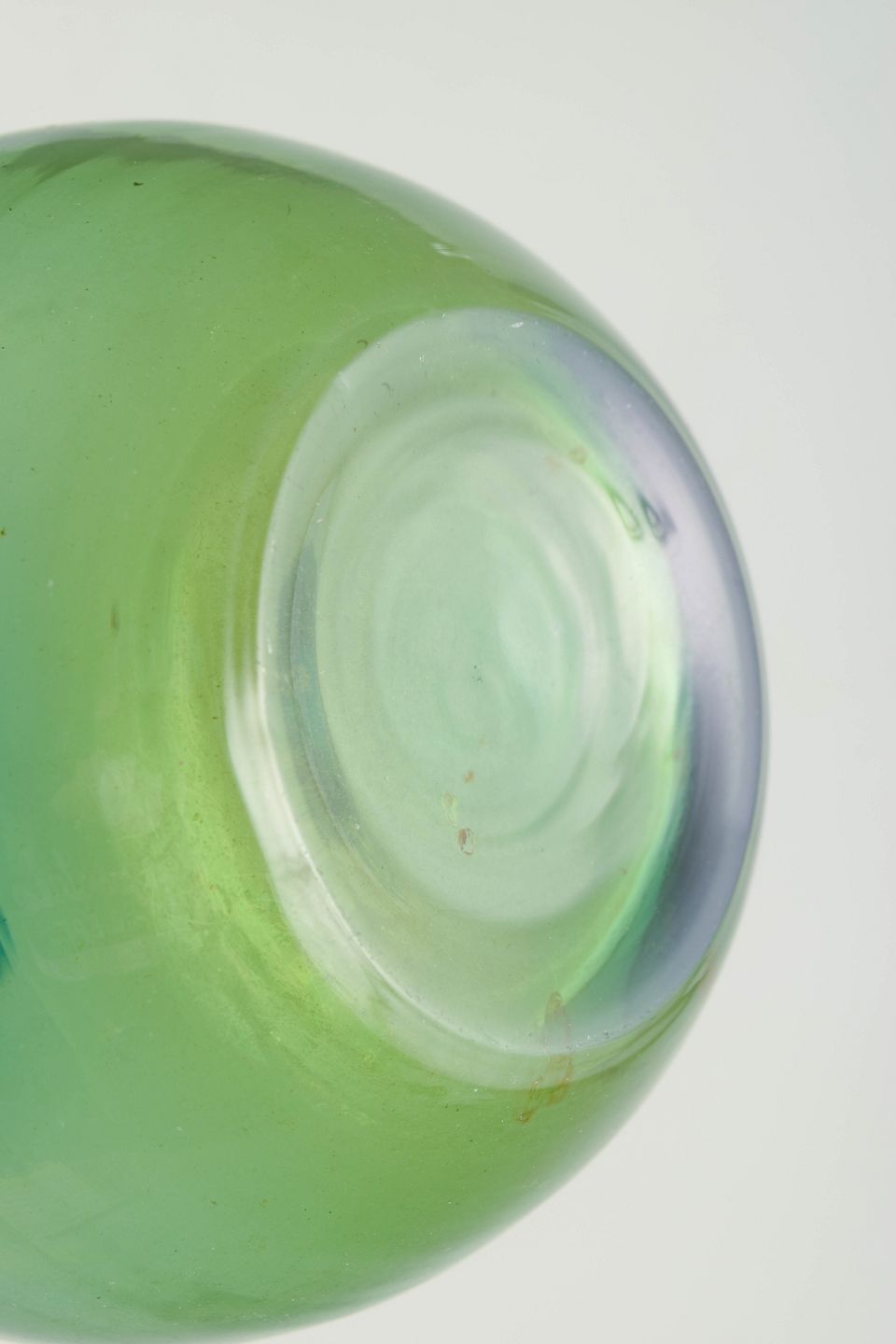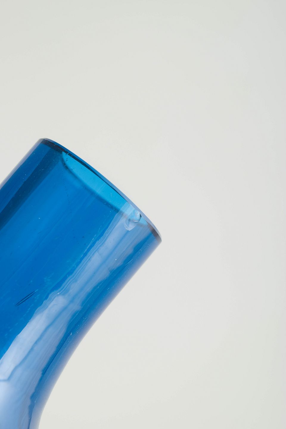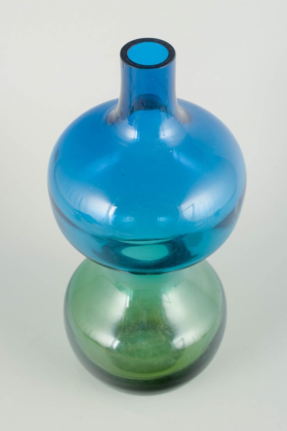 Mundblæst skandinavisk studioglas med tonegradueret farveskift fra blå til grøn. Stor skulpturel dobbeltbalusterform med slank hals.