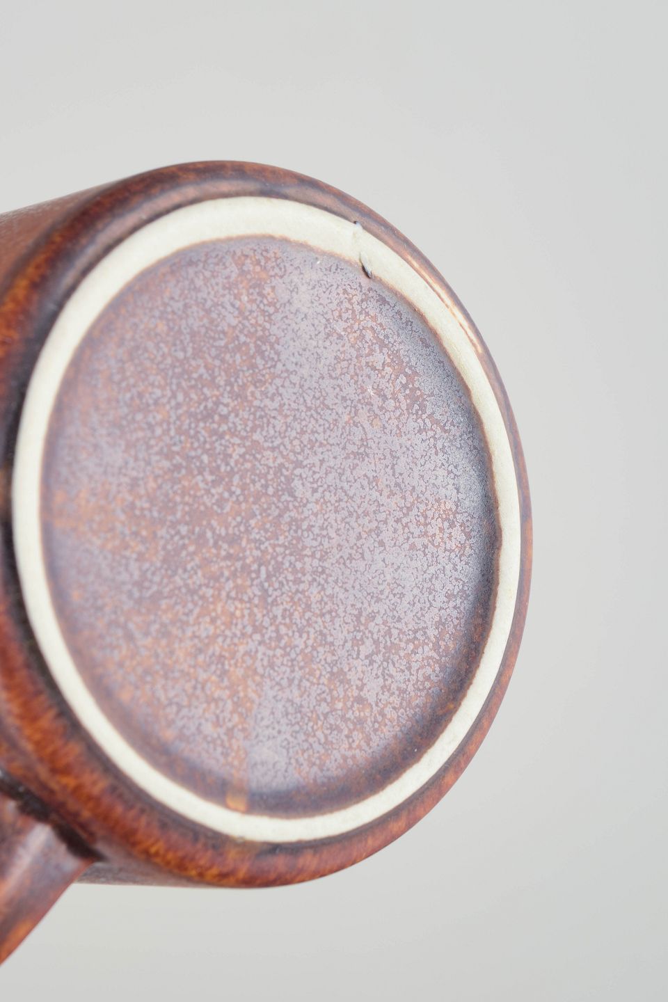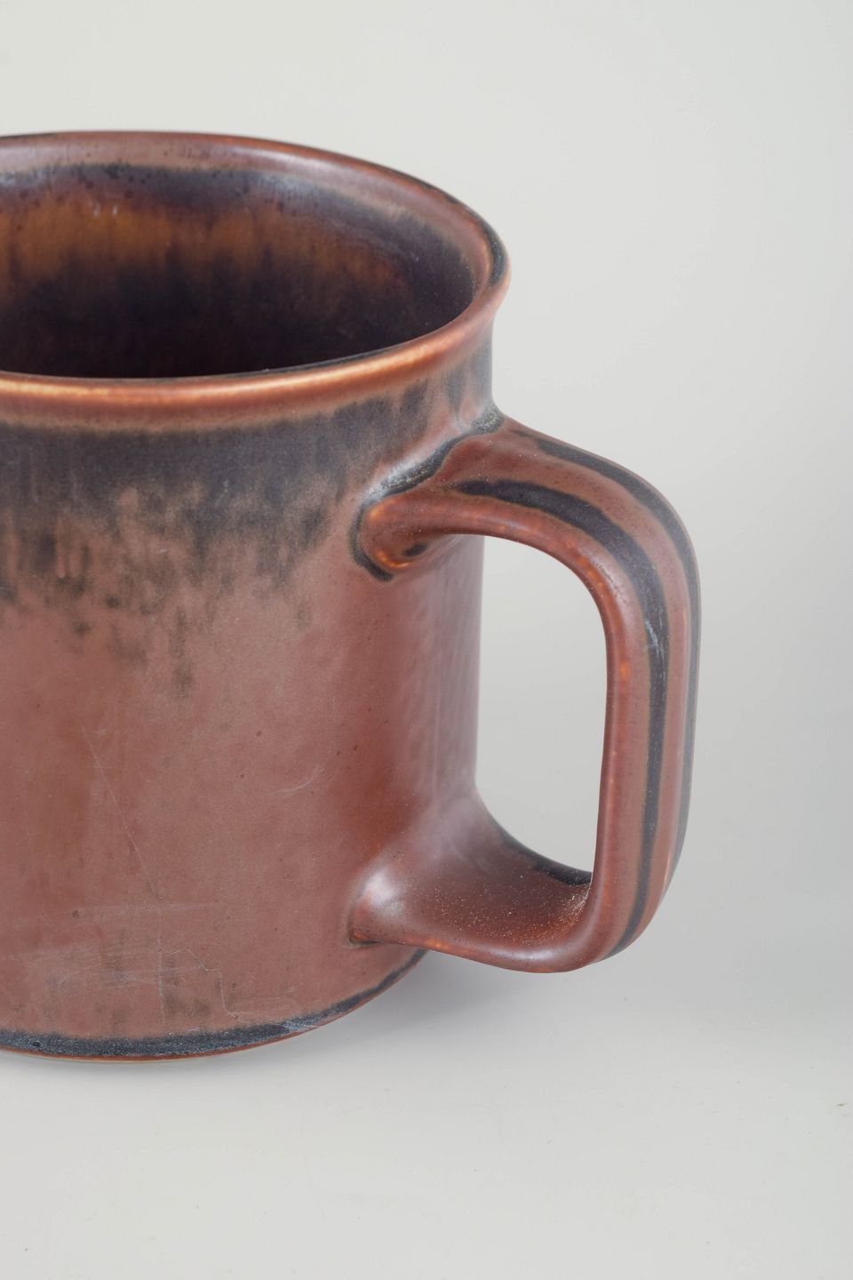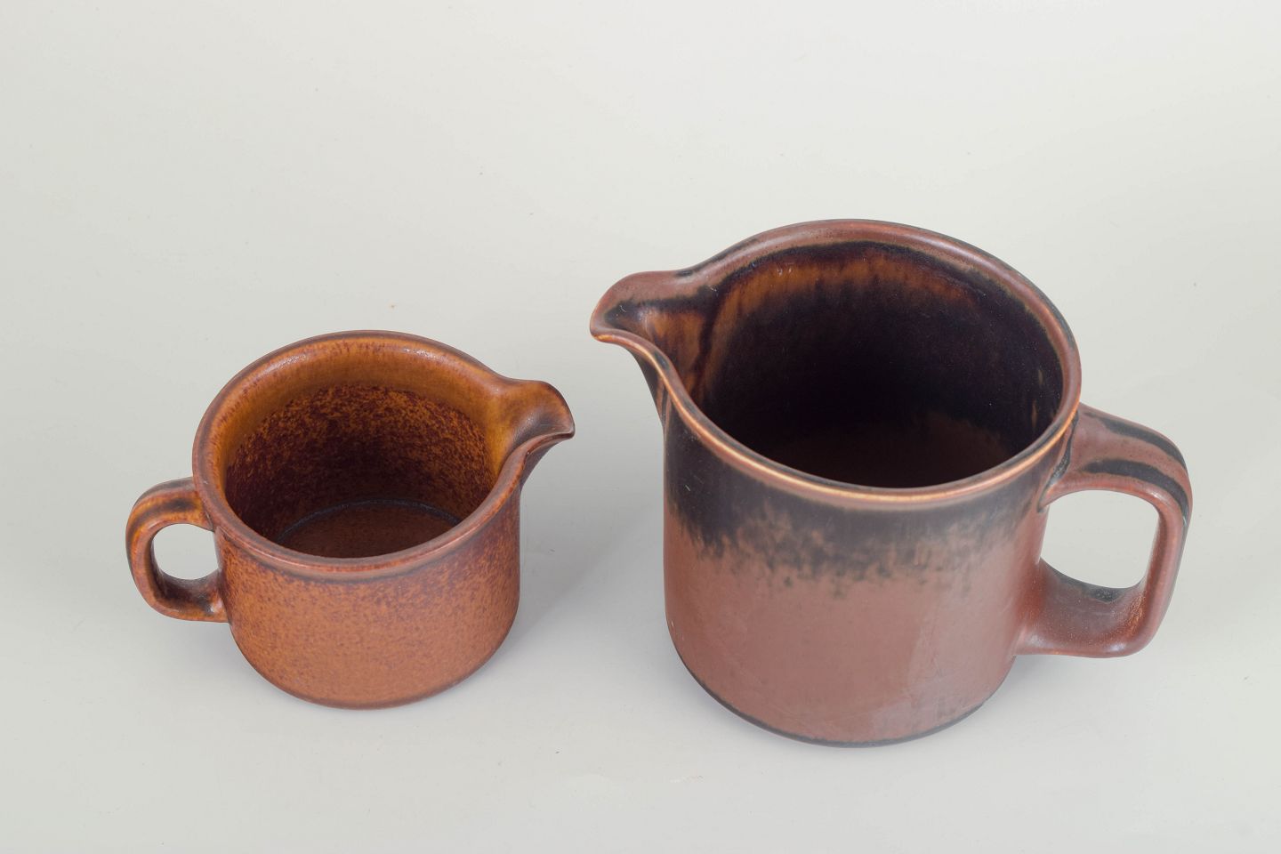 Cylindrisk form med integreret hank og hældetud, dækket af varm brun glasur med levende nuancer og mørk løbende kant.