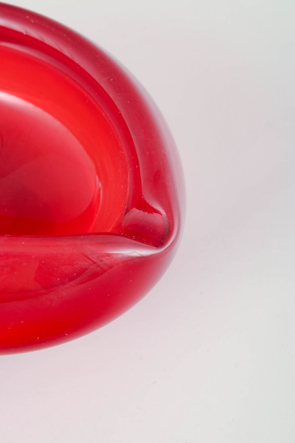 Organisk fritformet håndblæst skål i intens rubinrød sommerso-glas med blødt indfoldet rand og svævende klarhedsdybde — et klassisk eksempel på studioglas fra Murano.