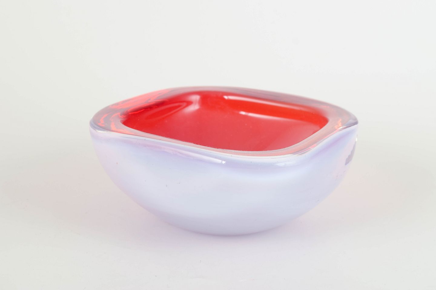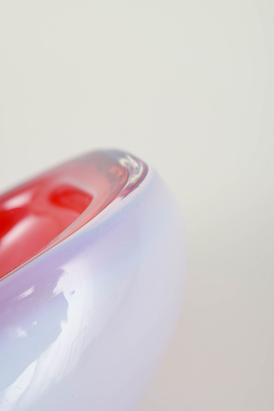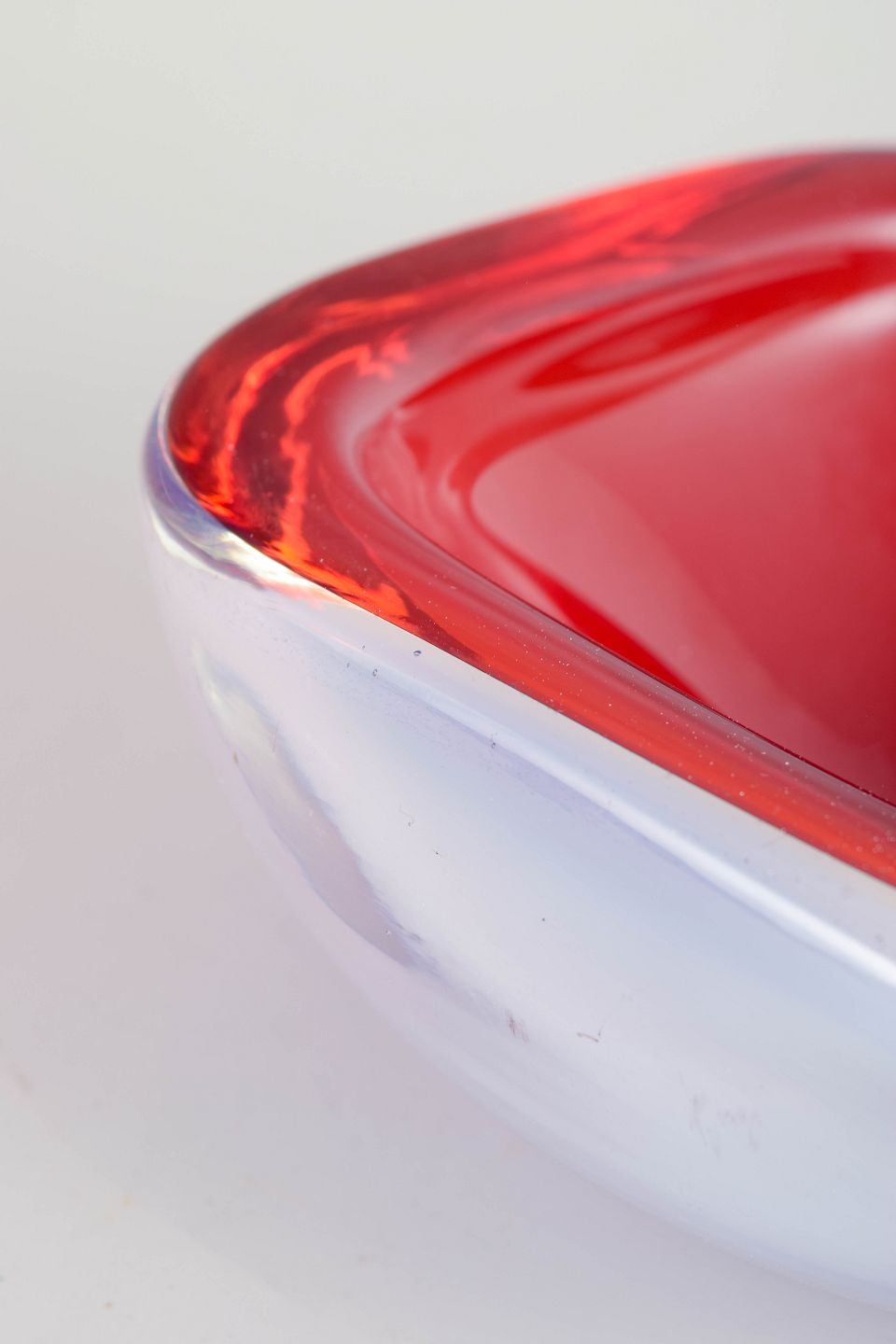 Organisk fritformet håndblæst skål i lagdelt sommerso-teknik med rubinrød indre kerne indkapslet i opalhvid ydre glasmasse – et elegant og skulpturelt eksempel på klassisk Murano-studioglas.