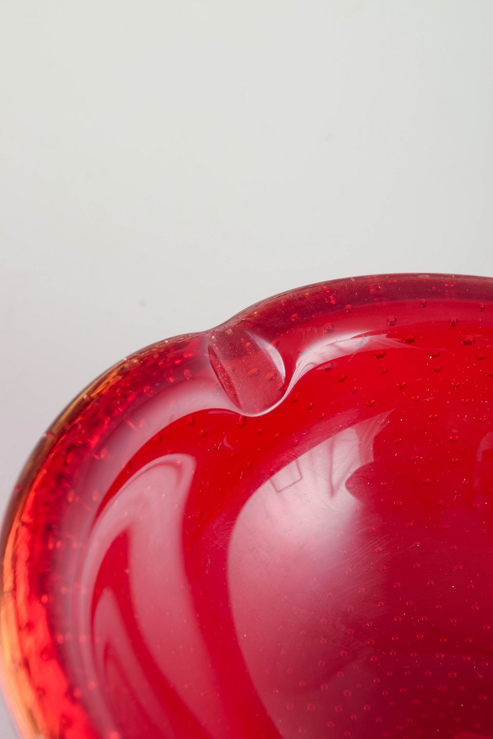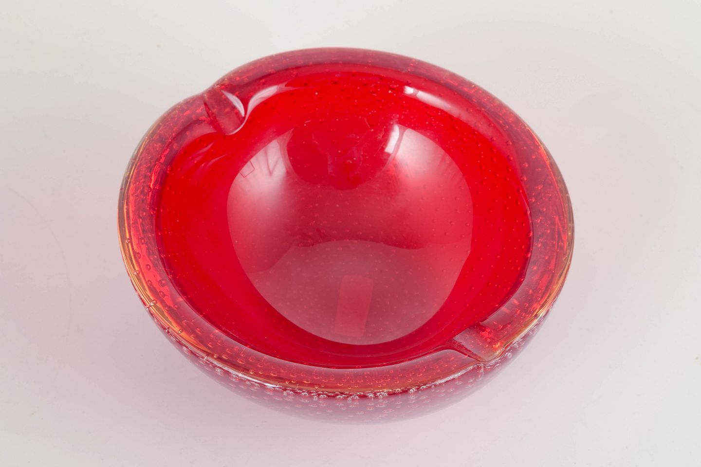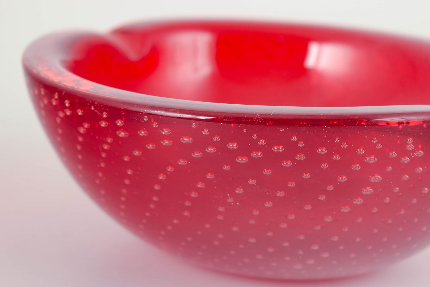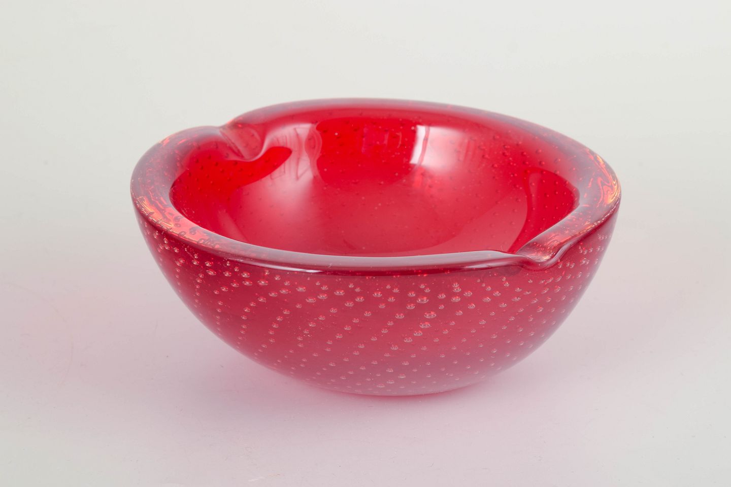 Organisk formet håndblæst skål i rød sommerso-teknik med fanget luftboblemønster (bullicante), karakteristisk for italiensk Murano-glasproduktion.