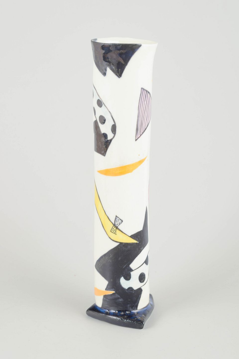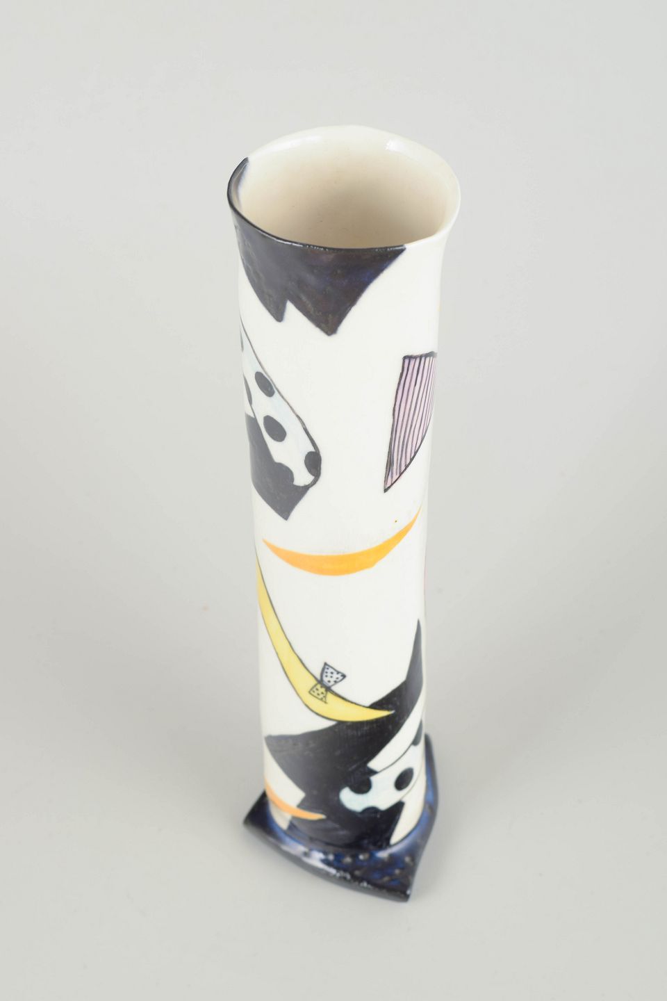 Håndlavet triangulær studiovase i hvidglaseret stentøj med grafisk, Memphis-inspireret dekoration i blå, gul og sorte toner.