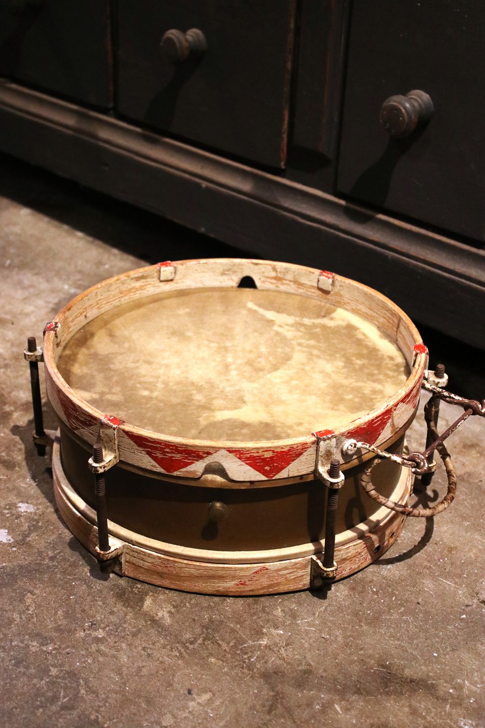 Dekorativ , gammel tromme i messing med malet træ kanter