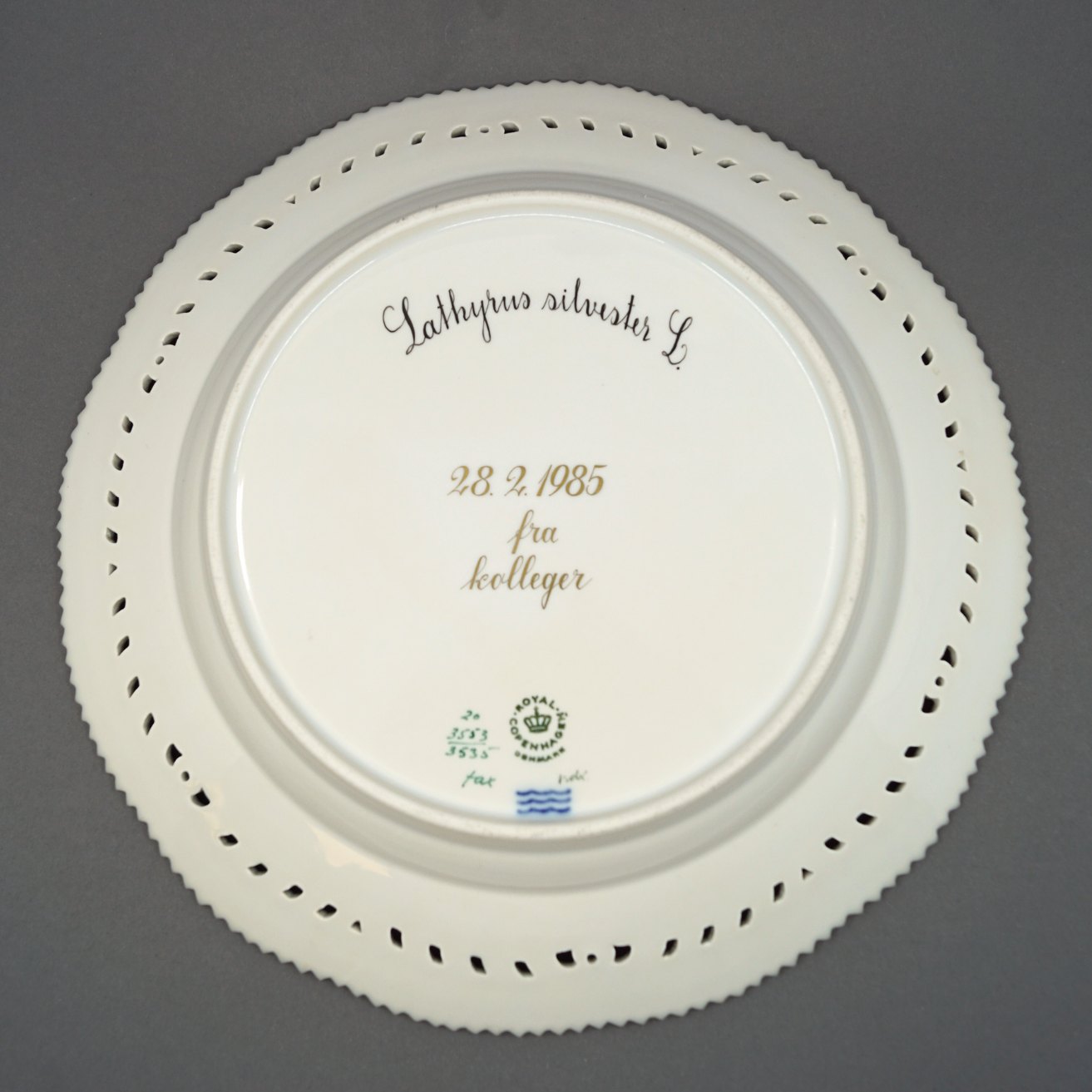 Text zugänglich auf Dänische: oyal Copenhagen, Flora Danica porcelæn; Middagstallerken #3553/3535 med gennembrudt kant.