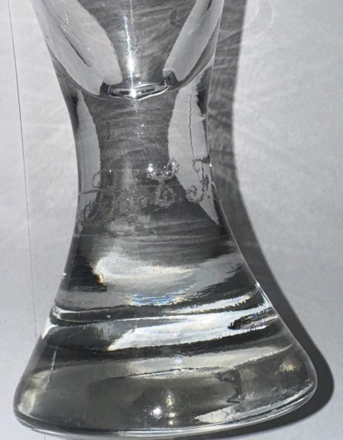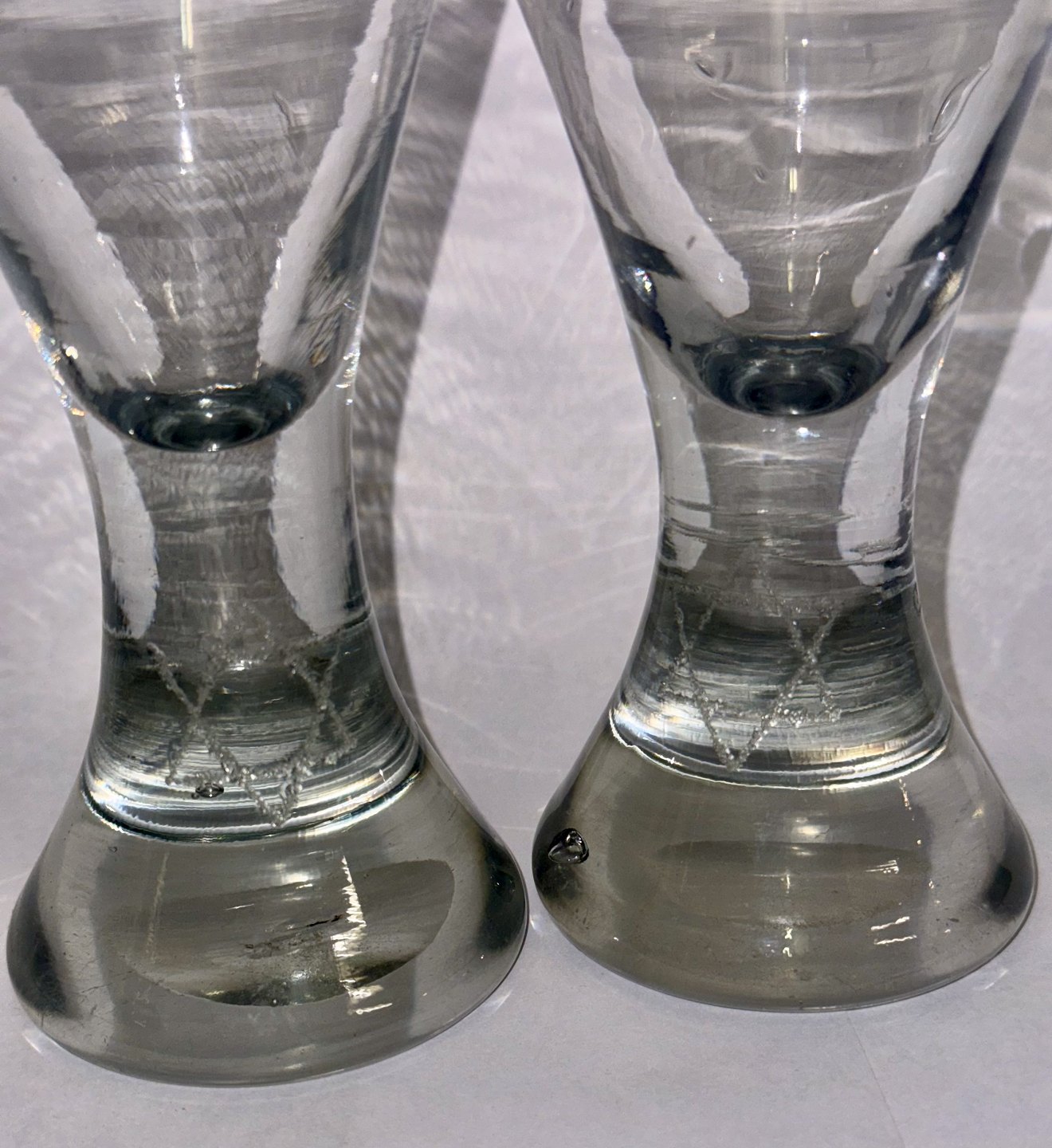 Par timeglasformede frimurer glas. Begge graveret med Davidsstjernen. Ét glas med indgraverer initialer. Begge glas tydeligvis gamle idet der ses flere indikatorer herpå, bl.a. små “lus” i glasmassen, kugleslibning på bunden samt brugsspor. Ingen skader eller reparationer. H. 13 cm