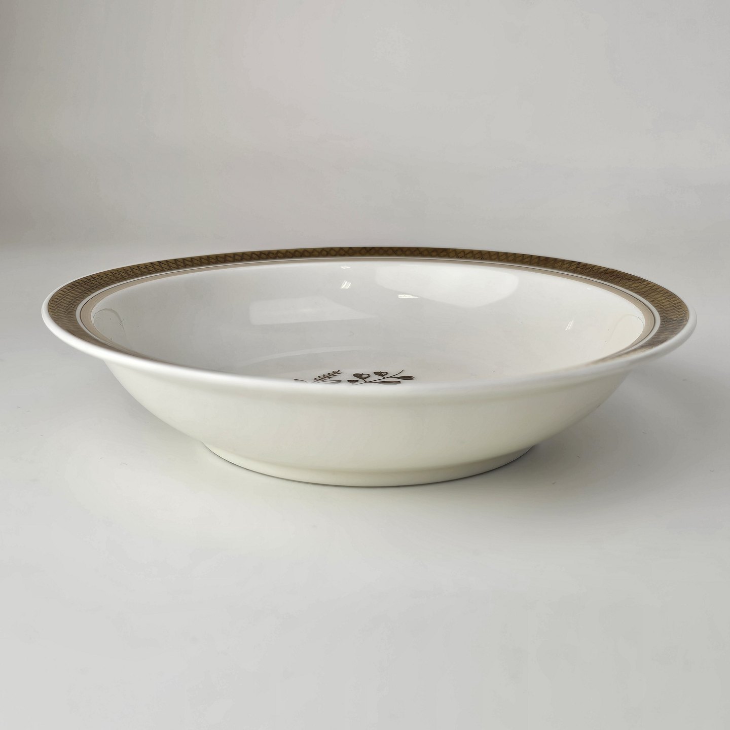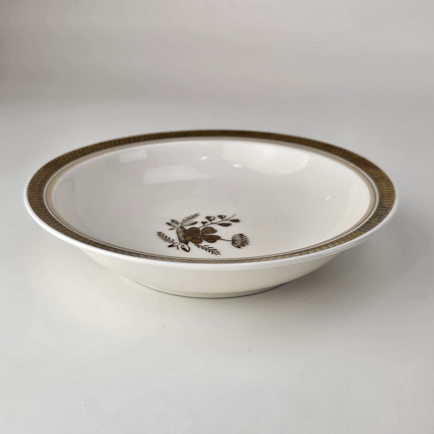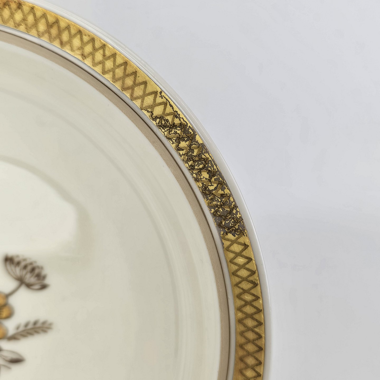 Cremefarvet porcelæn med motiv af gylden kløverblomst og bred graveret guldkant.
