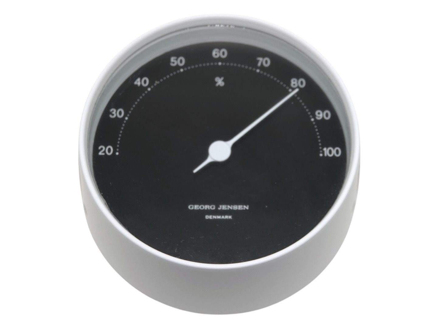 Georg Jensen Hygrometer i hvid kasse med sort skive.