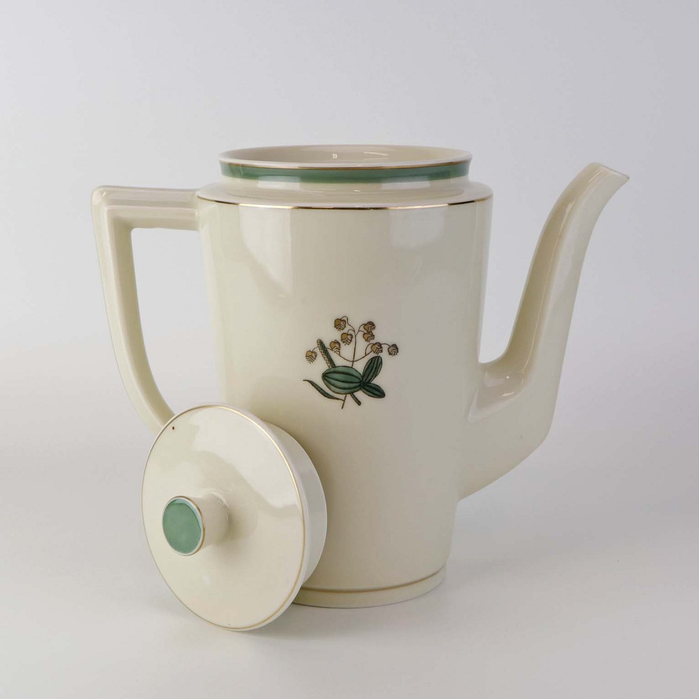 Stel i glat råhvidt porcelæn dekoreret med lysegrøn stribe og guldkant samt motiv af hjertegræs.