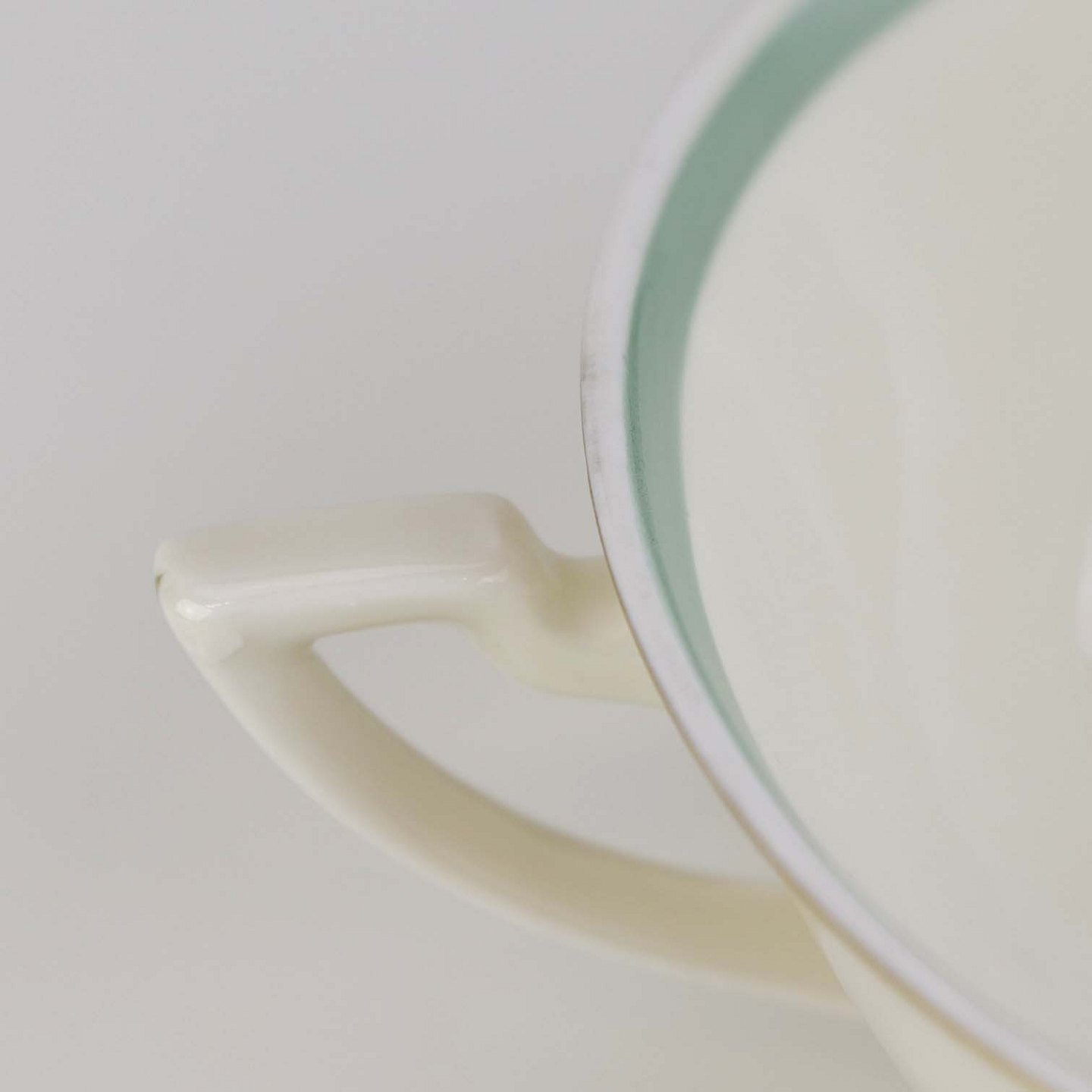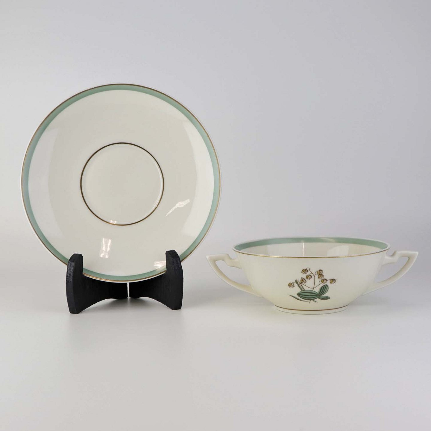 Stel i glat råhvidt porcelæn dekoreret med lysegrøn stribe og guldkant samt motiv af hjertegræs.