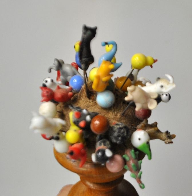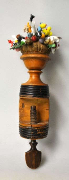 Antike dänische Nähschraube mit Nadelkissen, Dänemark, 19. Jahrhundert. Fassförmig aus Birkenholz mit schwarzen Bändern. Im Nadelkissen befinden sich über 40 verschiedene Nadeln mit Glasfiguren, darunter Elefanten, Hunde, Katzen, Hühner, Enten usw. Höhe mit Nadeln: 30 cm.