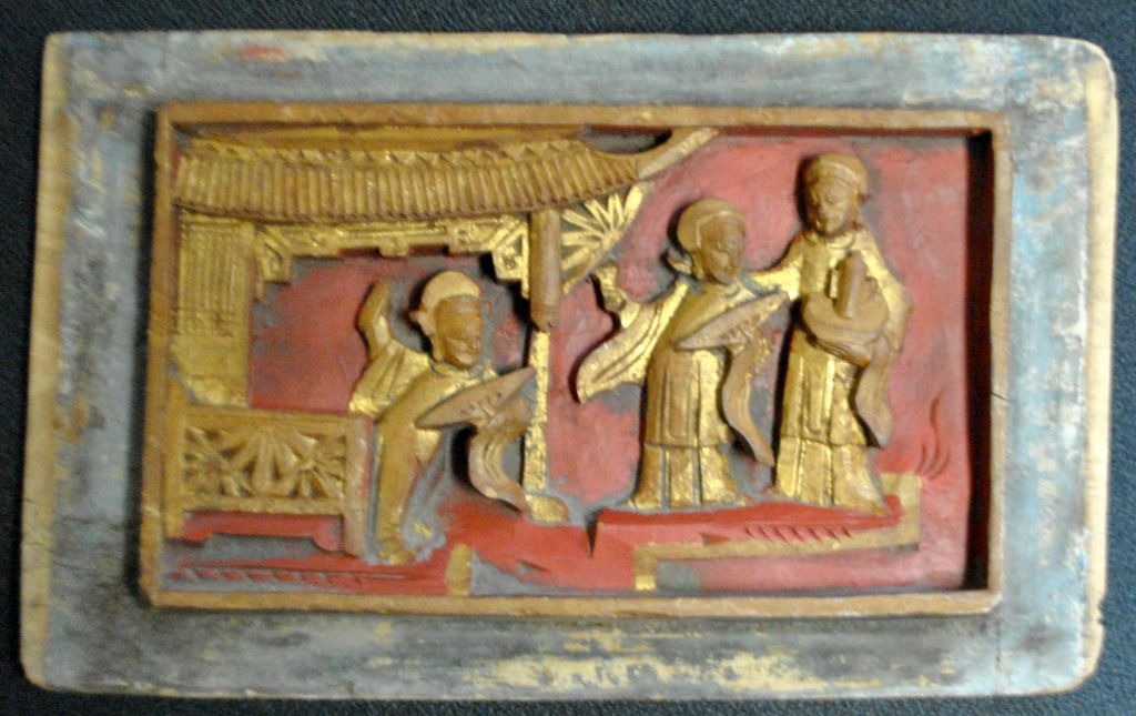 Antike chinesische bemalte Holzschnitzerei, 19. Jahrhundert.