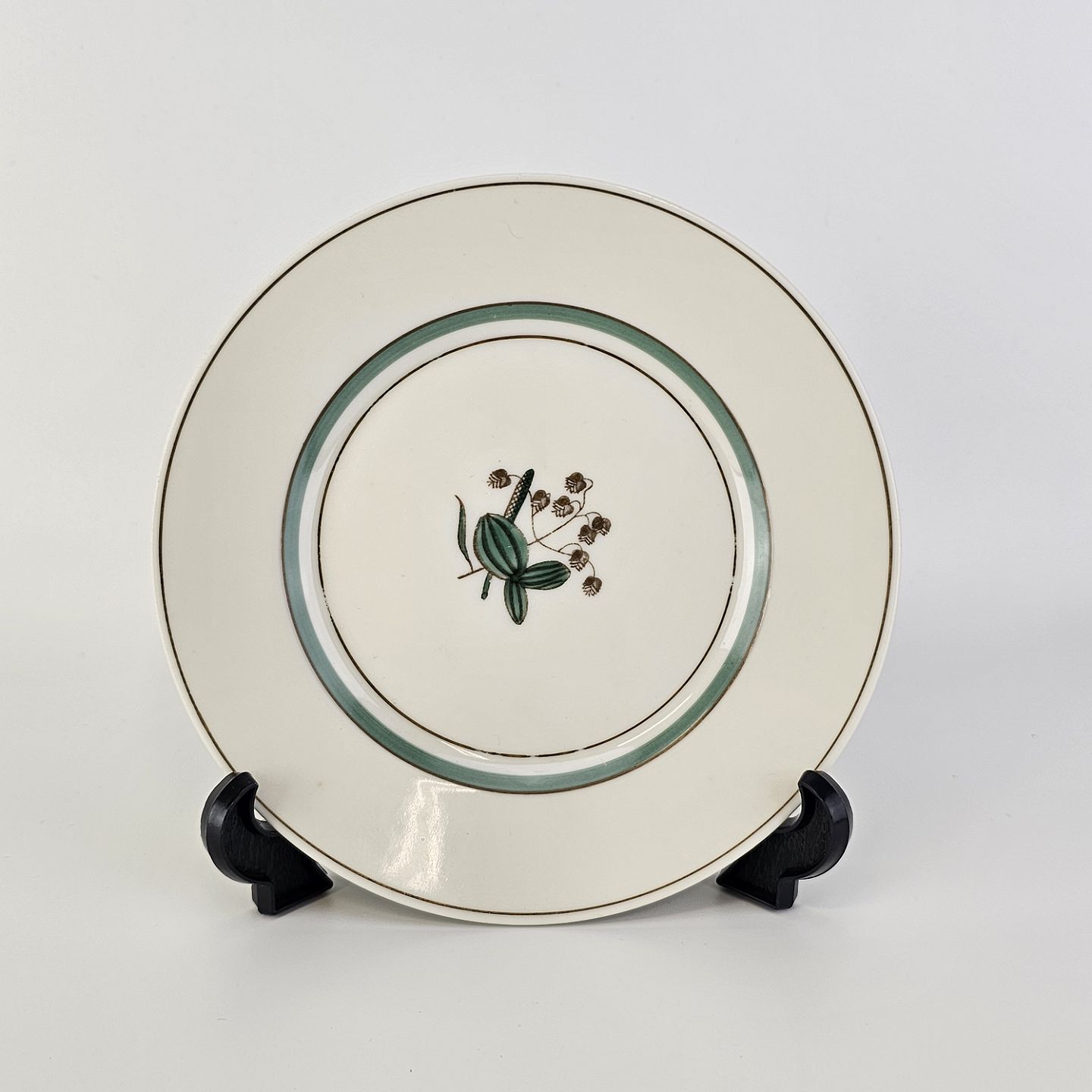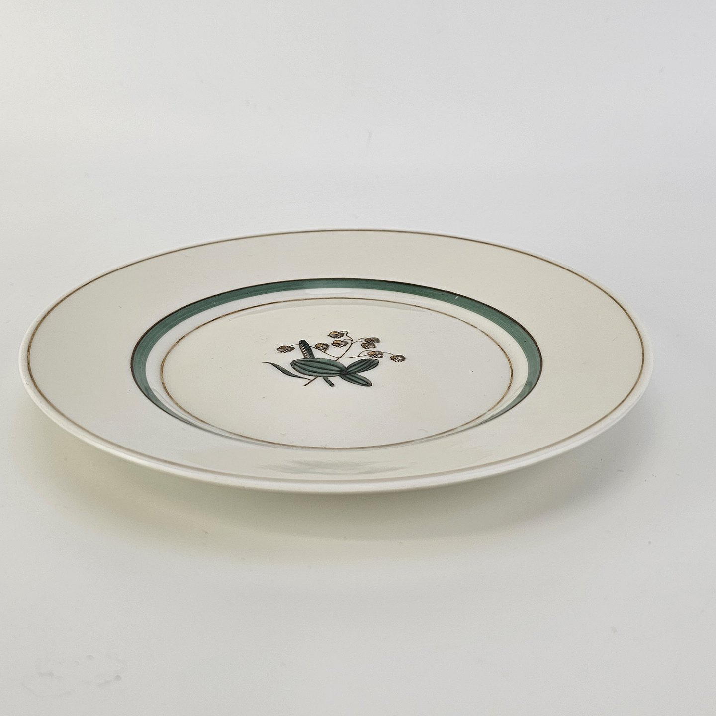 Stel i glat råhvidt porcelæn dekoreret med lysegrøn stribe og guldkant samt motiv af hjertegræs.