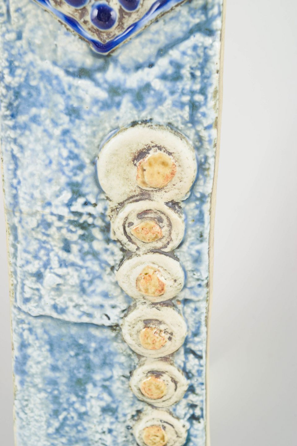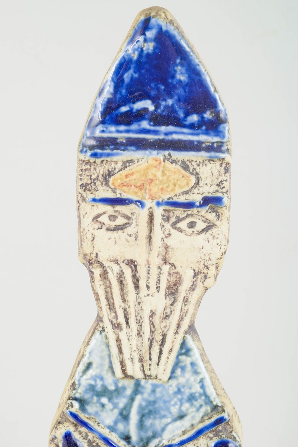Monumental håndglaseret vægfigur i chamotteret stentøj med ikonisk stiliseret biskop-skikkelse i nuancer af himmelblå og dyb koboltblå med gyldne detaljer. Original ophæng monteret på bagsiden.