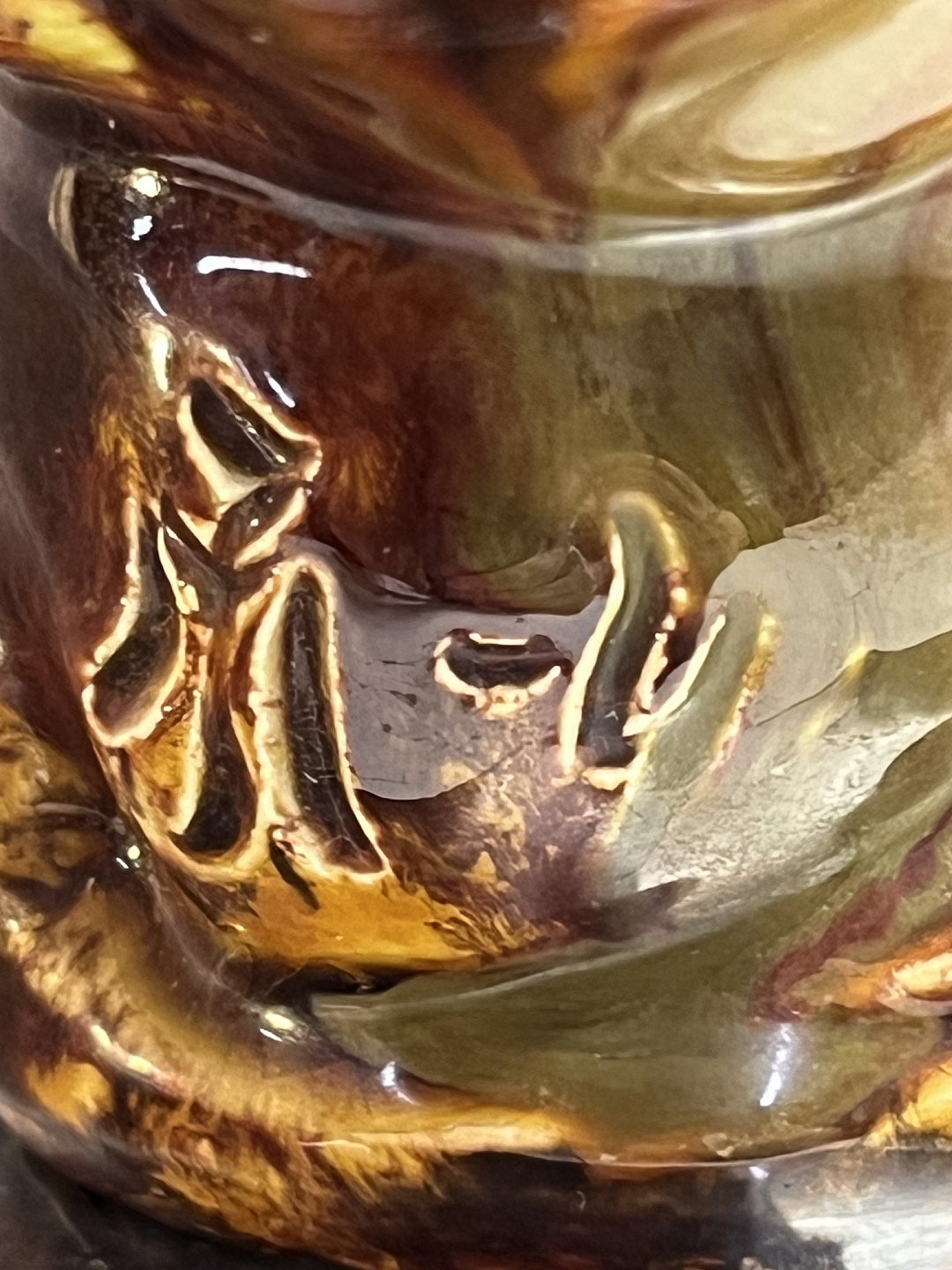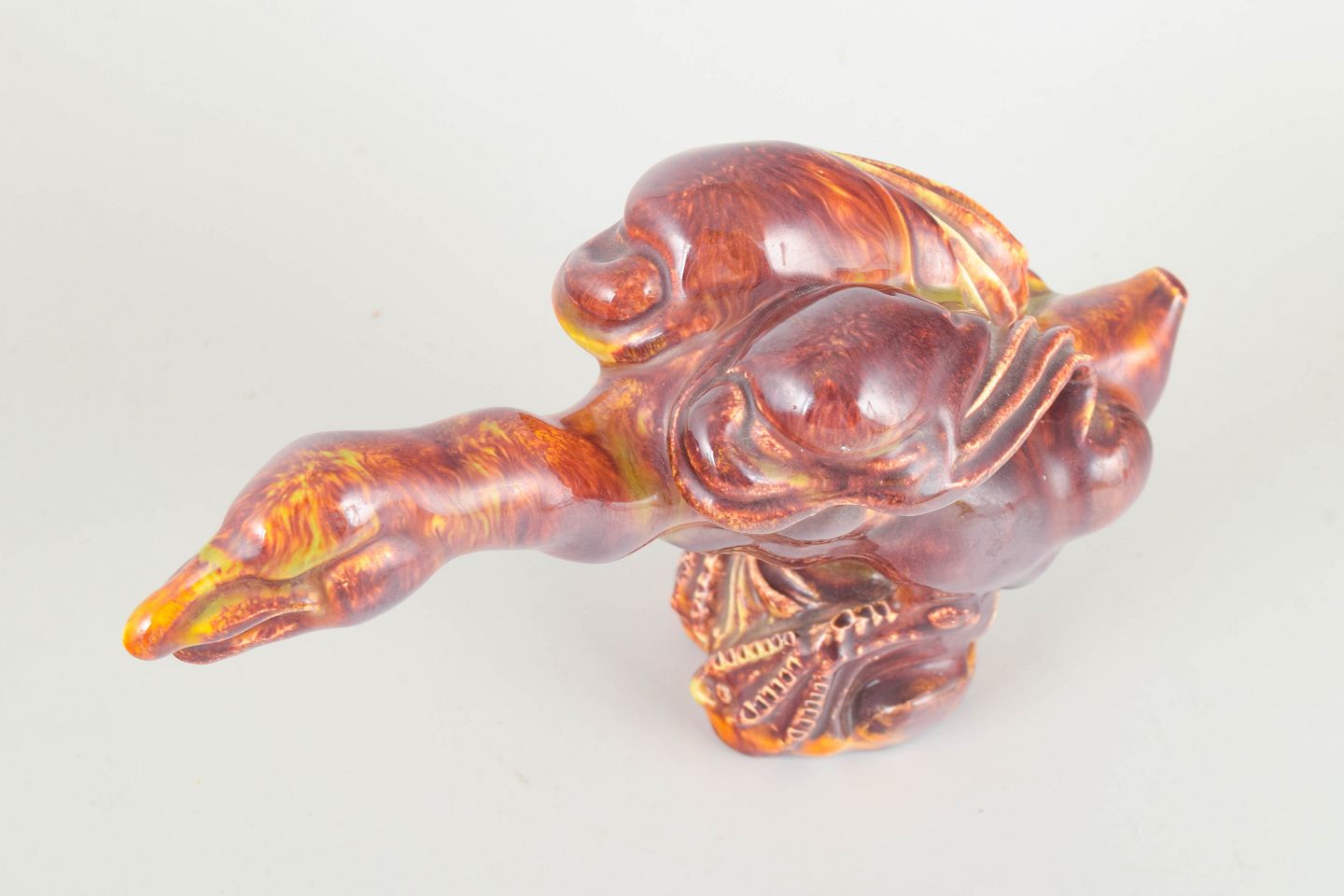 Unik, håndformet figur af fugl i glaseret stentøj med levende, flammende rød-orange glasur og kraftfuldt modelleret formsprog. Signeret med monogram under bunden.