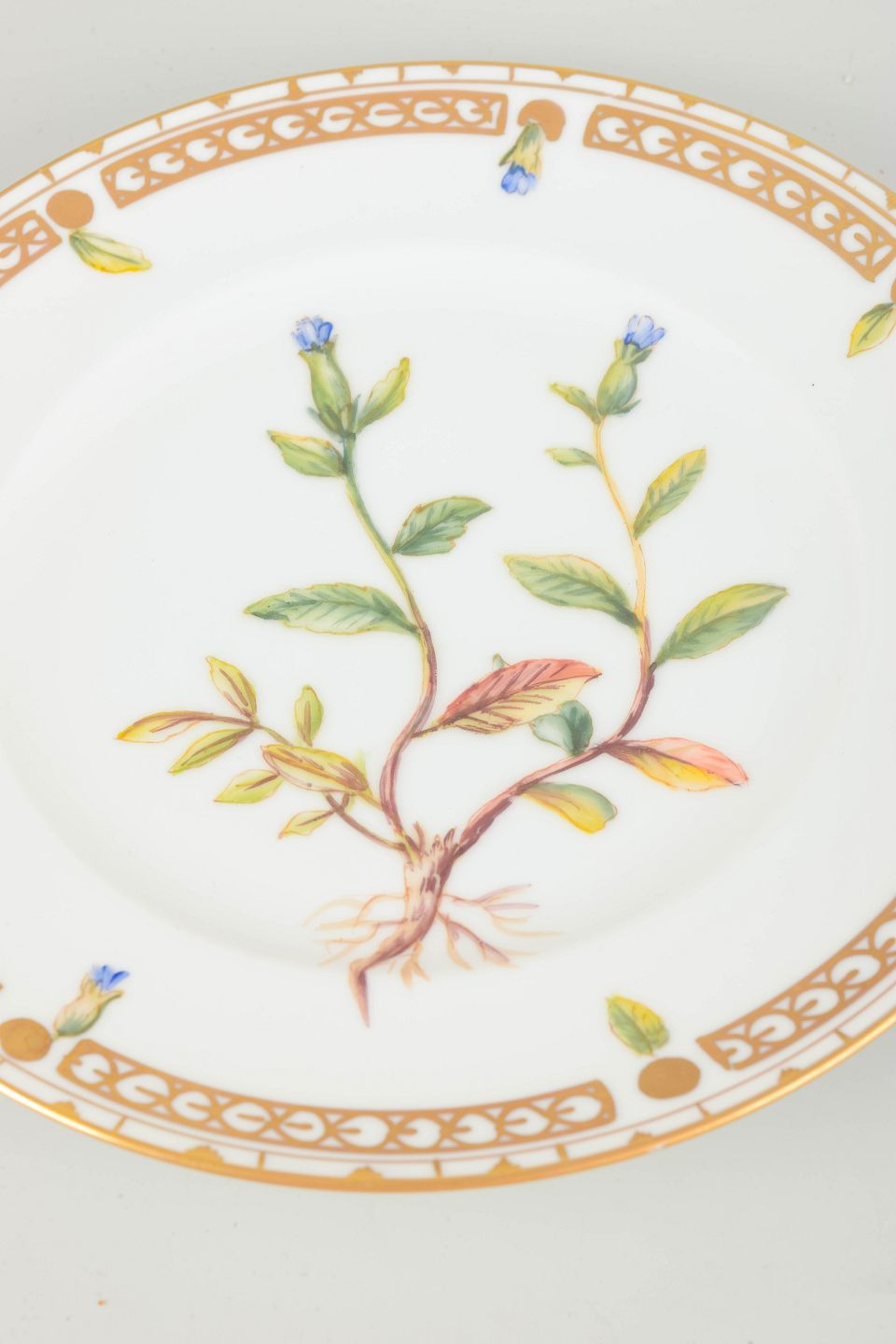 To porcelænstallerkener med håndmalede botaniske motiver og guldbemaling langs kanten. 2. sortering.