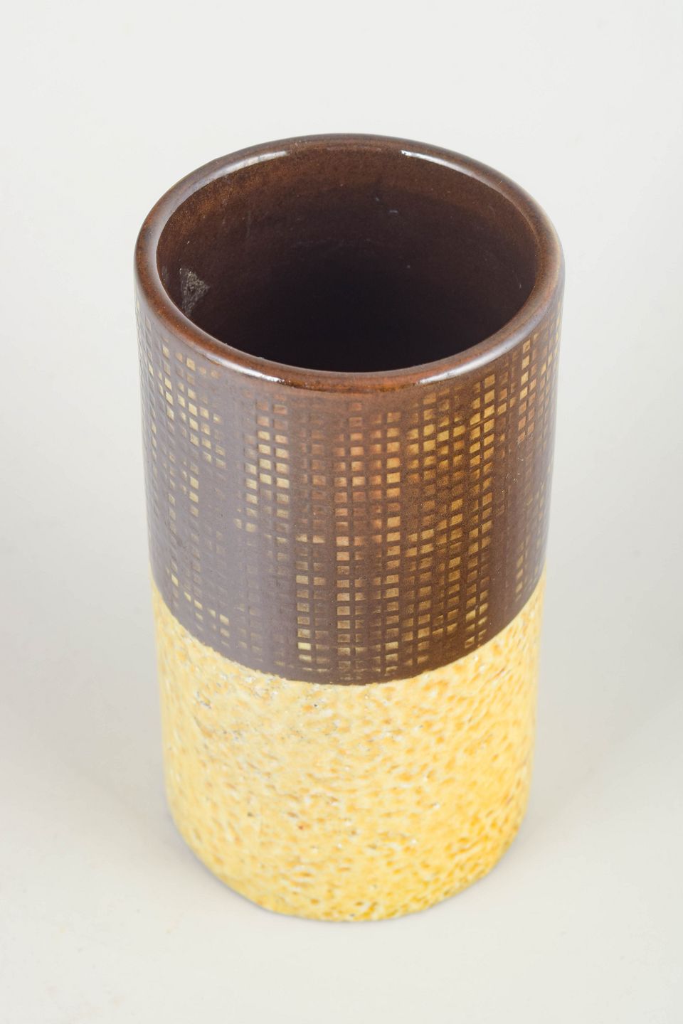 Cylindrisk stentøjsvase med todelt glasur — øvre sektion i brun geometrisk reliefstruktur og nederste del i lys gul taktil lavaglasur. Et signifikant eksempel på Atterbergs modernistiske formsprog og eksperimenterende overflader.