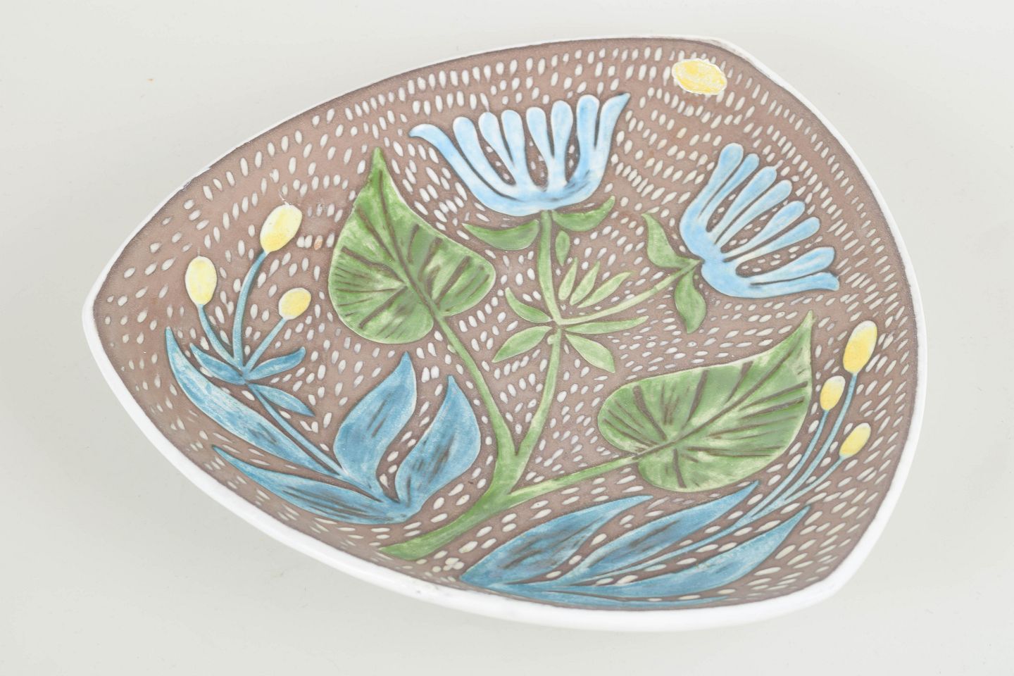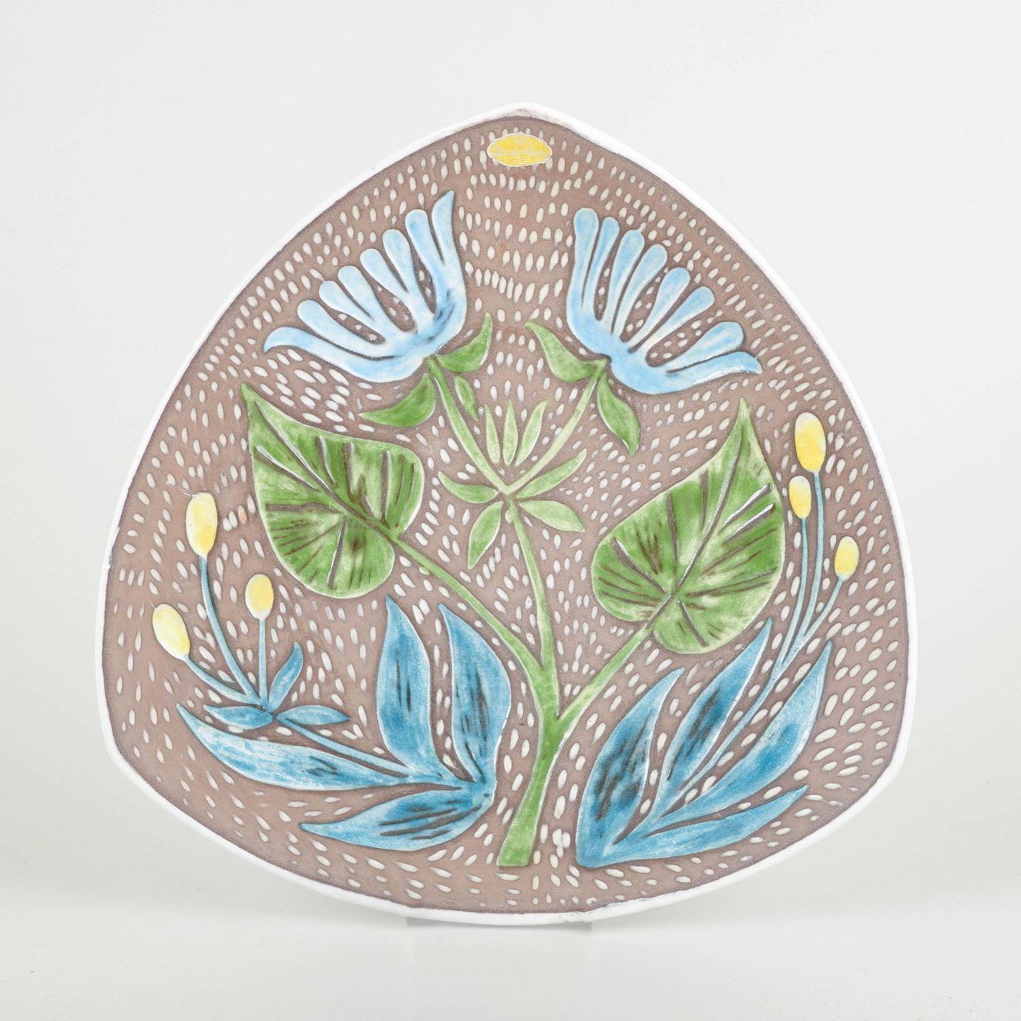 Triangulært formet dekorationsfad i glaseret stentøj med håndmalet botanisk motiv i blå, grønne og gule nuancer mod lys brun bund. Model 1029/176.