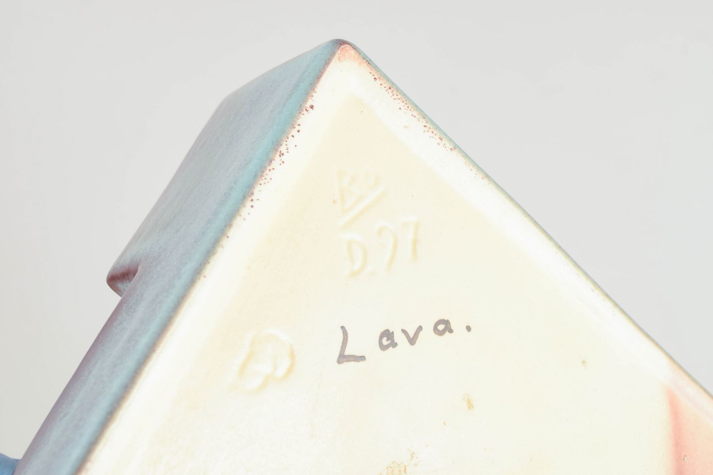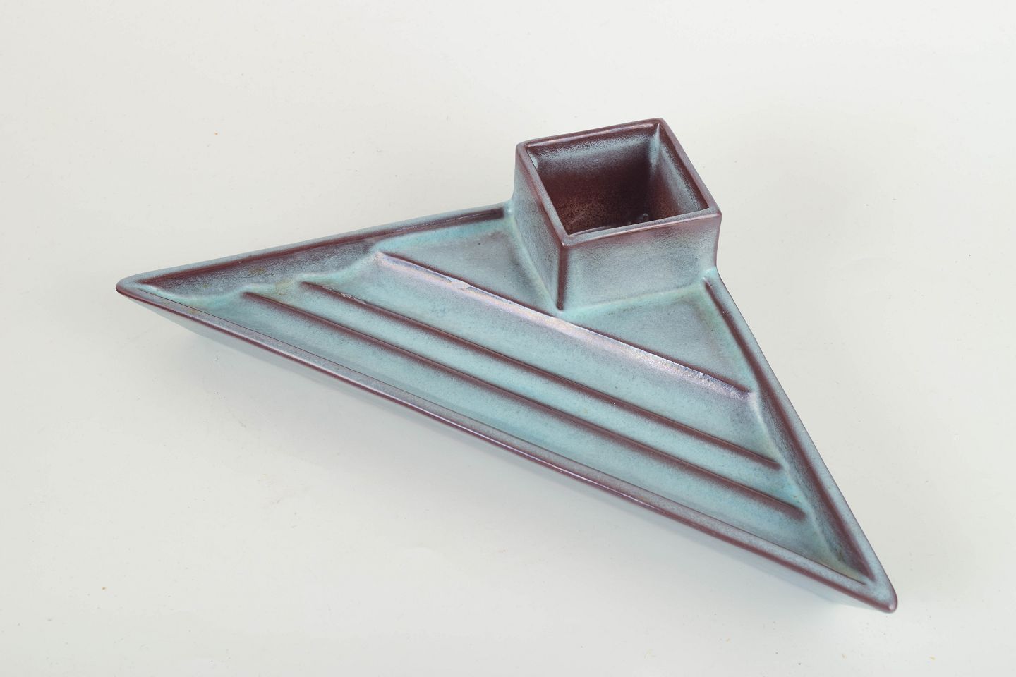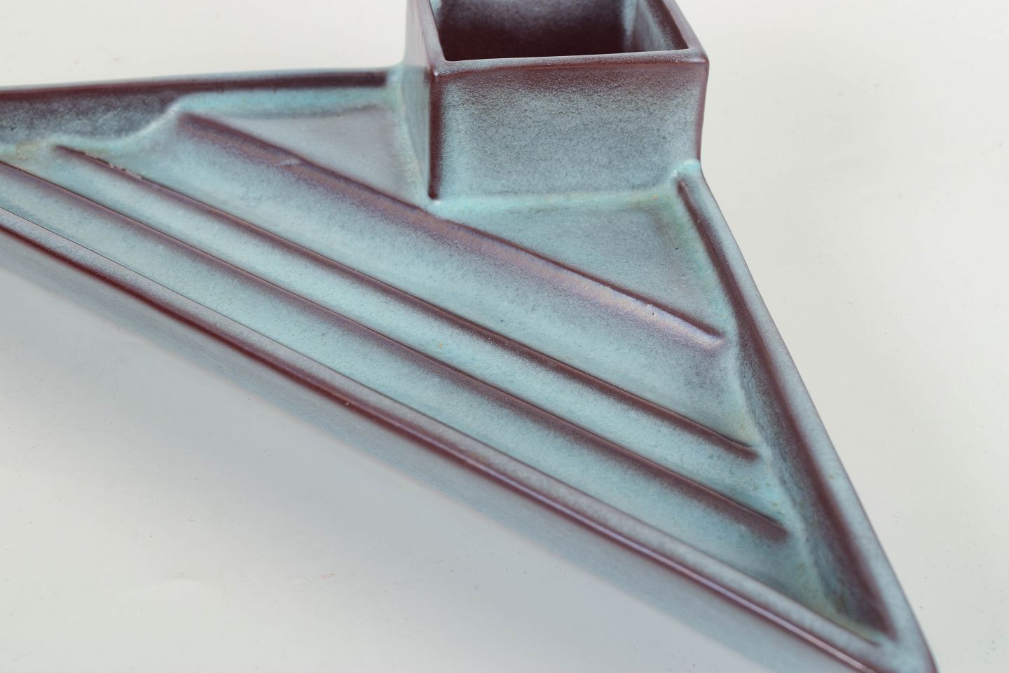 Sjælden Art Deco pennebakke i glasureret fajance med geometrisk, arkitektonisk formgivning og eksperimenterende lavaglasure i blå-violette toner.