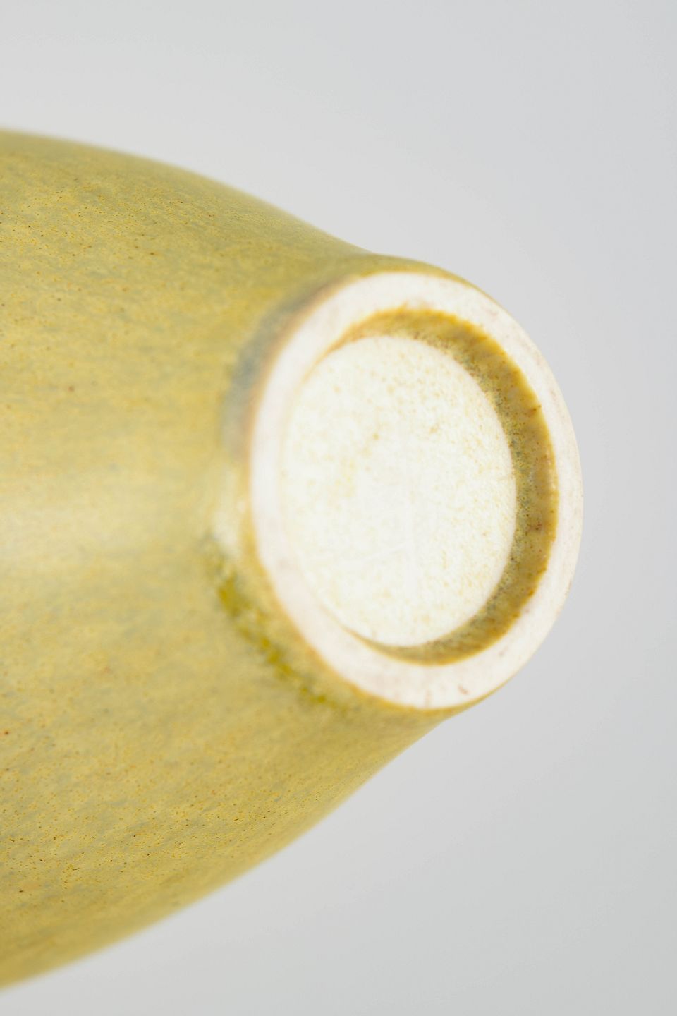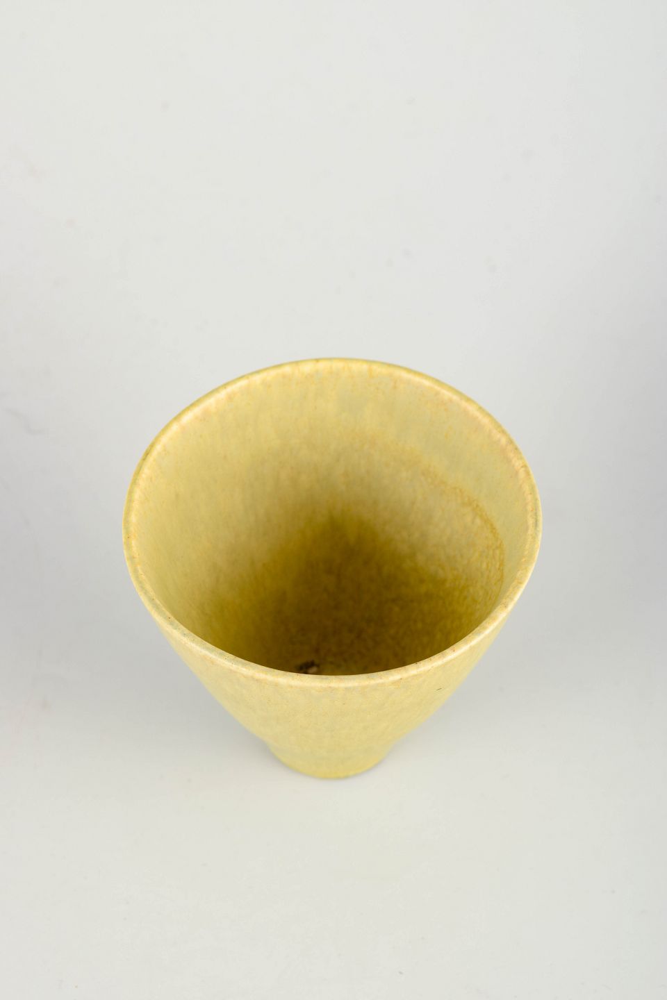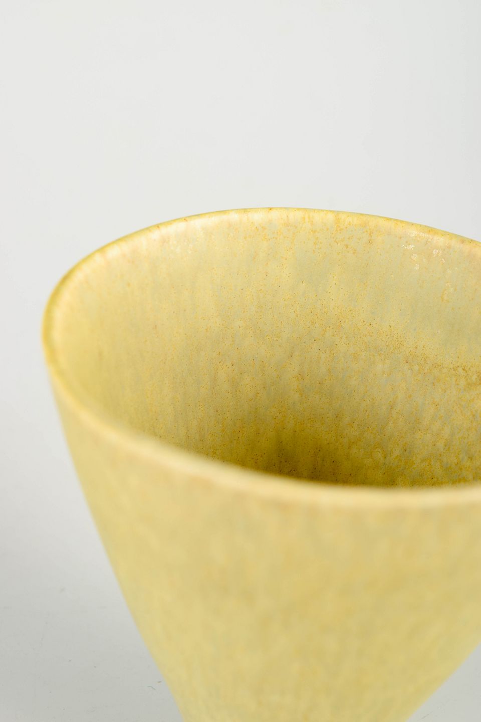 Lille konisk studiostykke i drejet stentøj med eksperimentel testglasur i douce gul tone, mat og let tekstureret overflade. Usigneret.