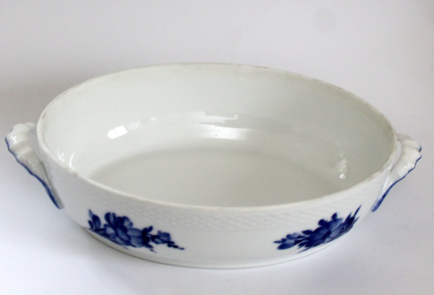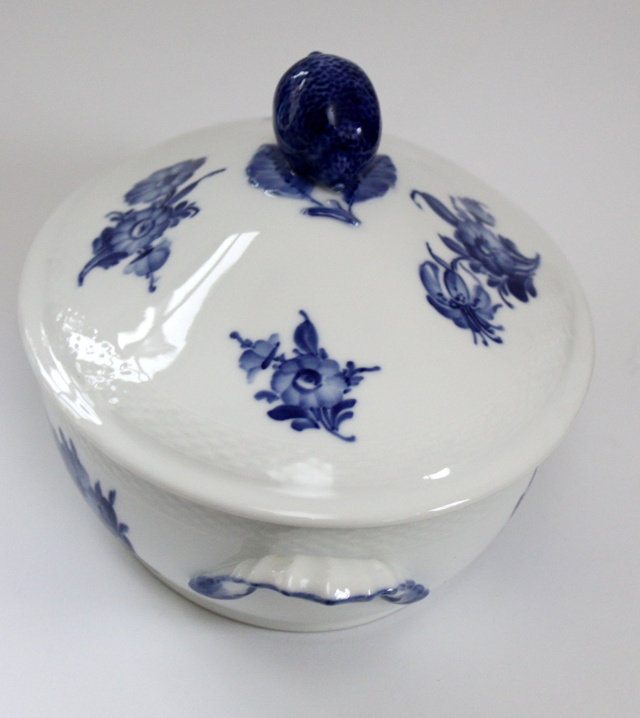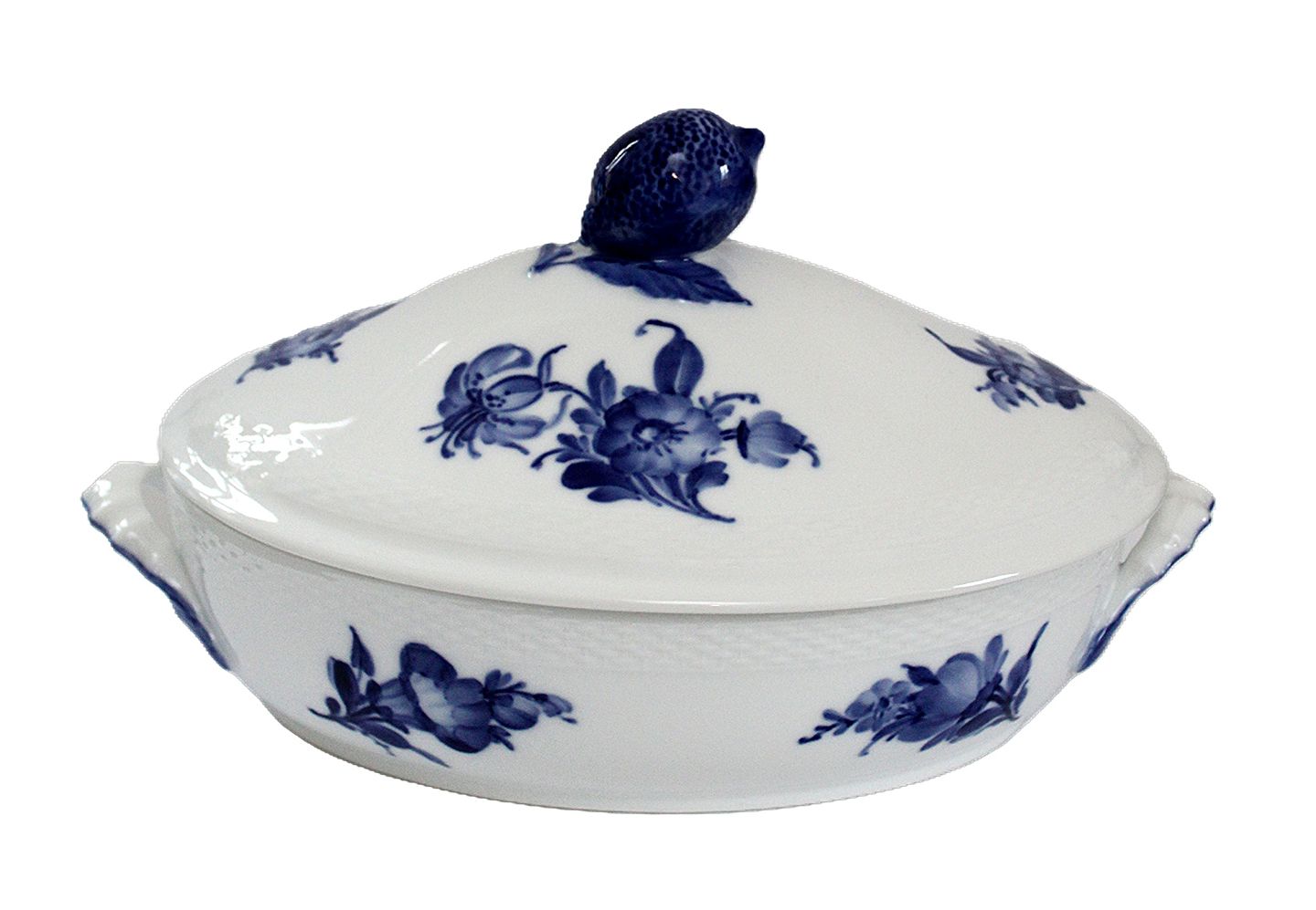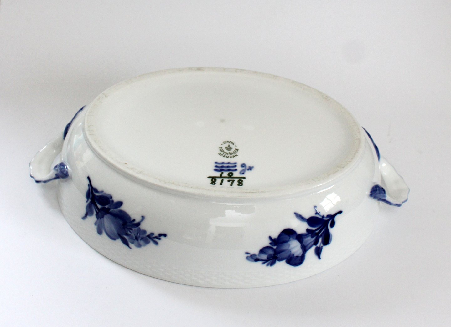 Text zugänglich auf Dänische: Royal Copenhagen, Blå Blomst flettet, Oval terrin med låg. Nr. 10/8172. Dateret 1945. Højde 15,5 cm. Længde 27,5 cm. Bredde 18 cm. I. sortering med sort brændingsplet på undersiden af låget. Pris: 1500 kr. stk. Lager: 1