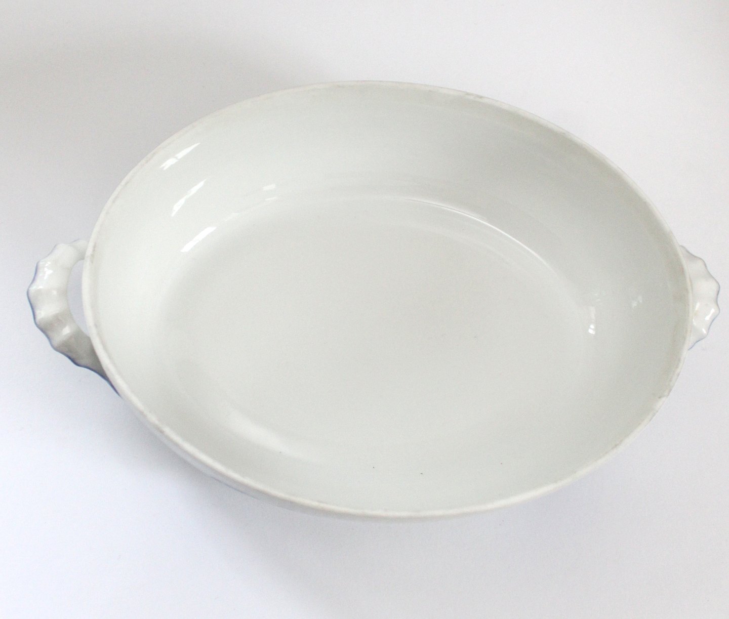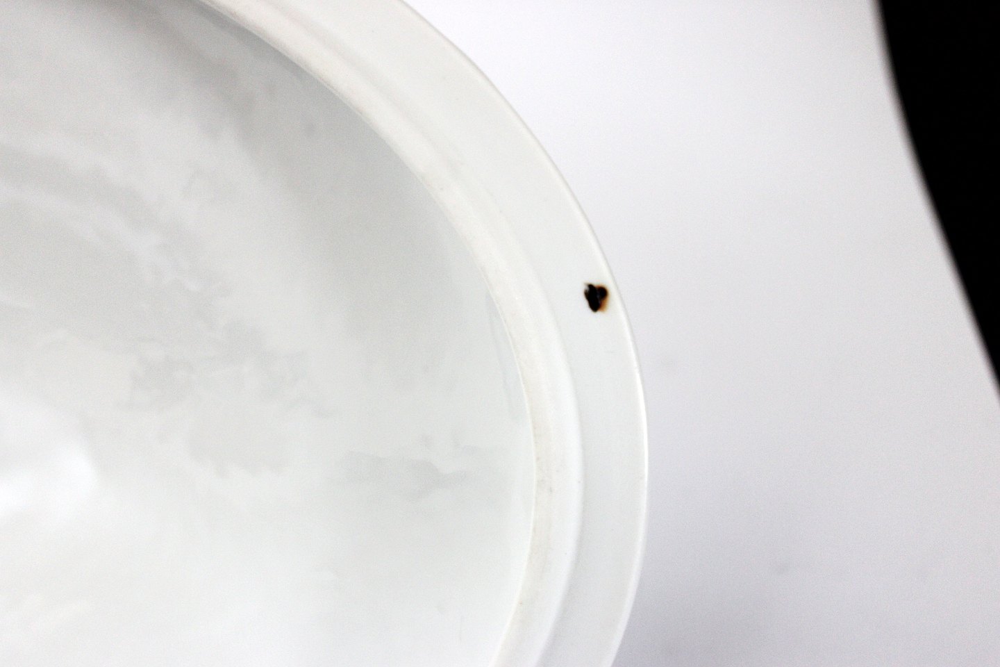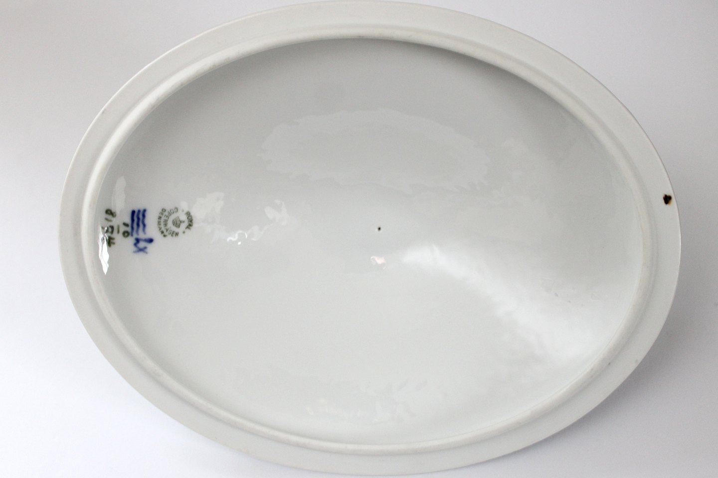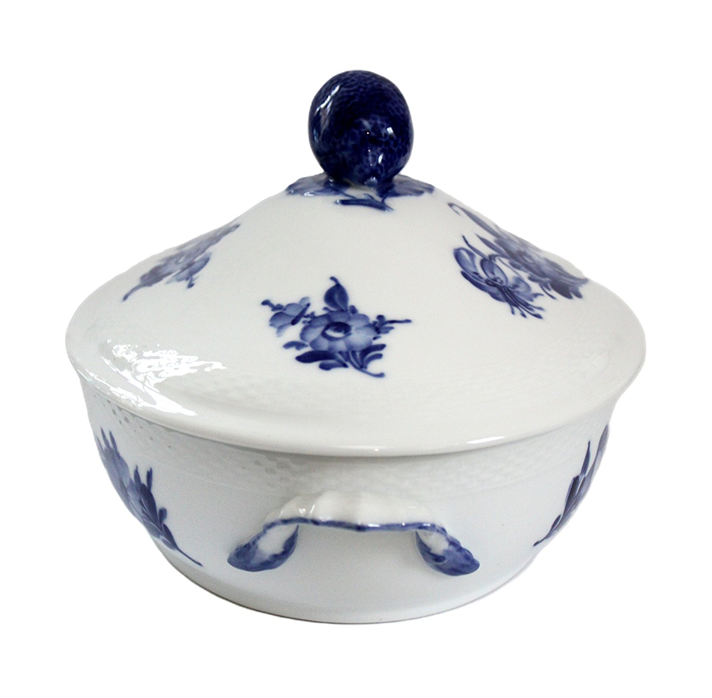 Text zugänglich auf Dänische: Royal Copenhagen, Blå Blomst flettet, Oval terrin med låg. Nr. 10/8172. Dateret 1945. Højde 15,5 cm. Længde 27,5 cm. Bredde 18 cm. I. sortering med sort brændingsplet på undersiden af låget. Pris: 1500 kr. stk. Lager: 1