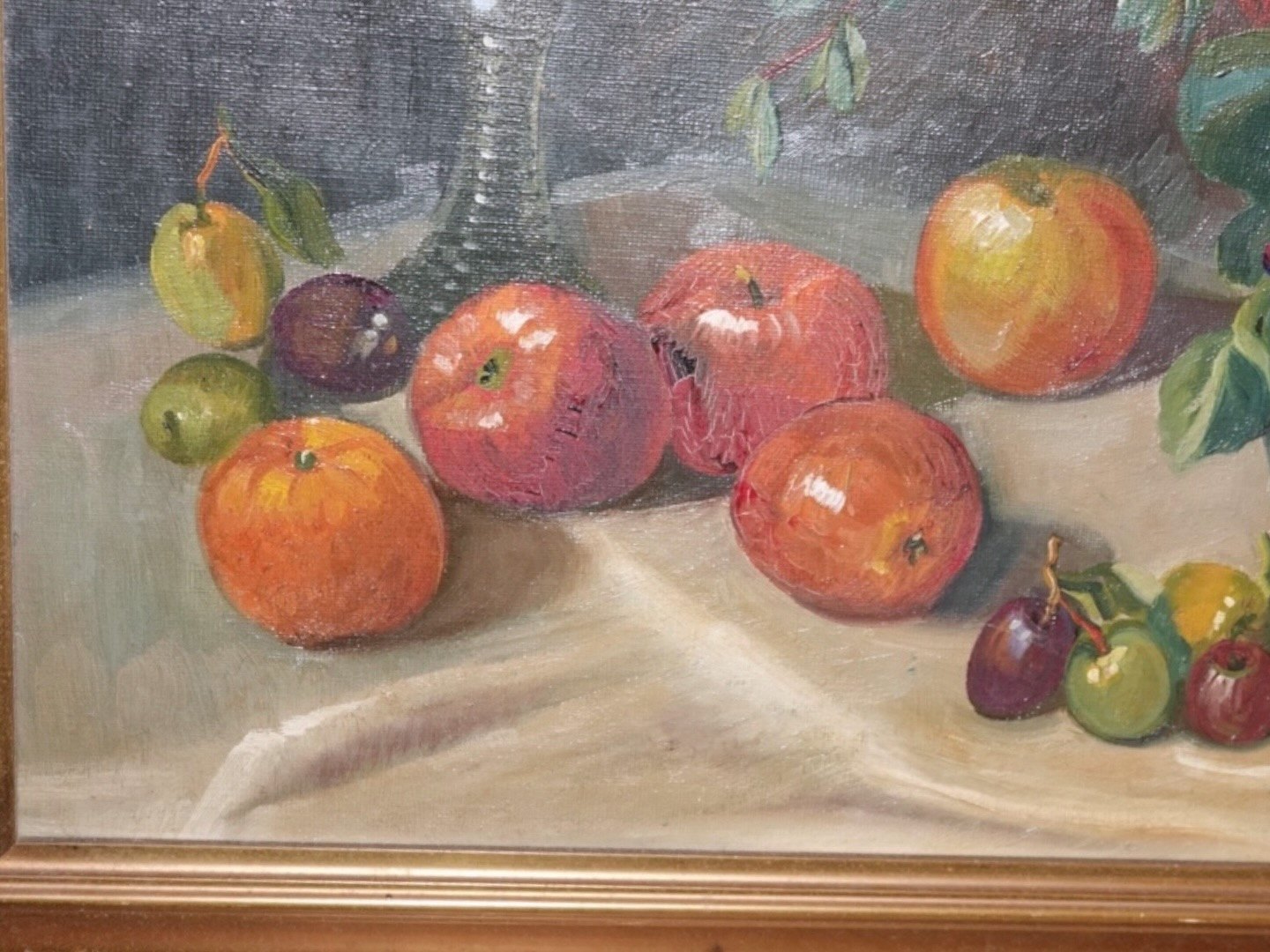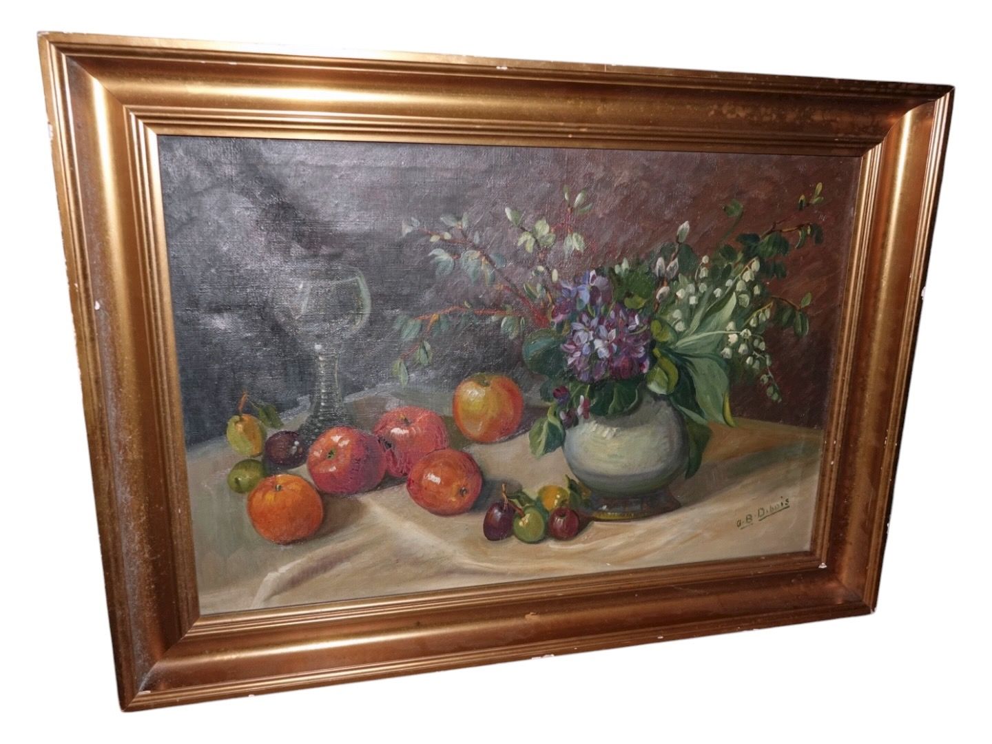 Ingeborg Debois (1897-1970) større oliemaleri, stilleben med frugter og blomster.