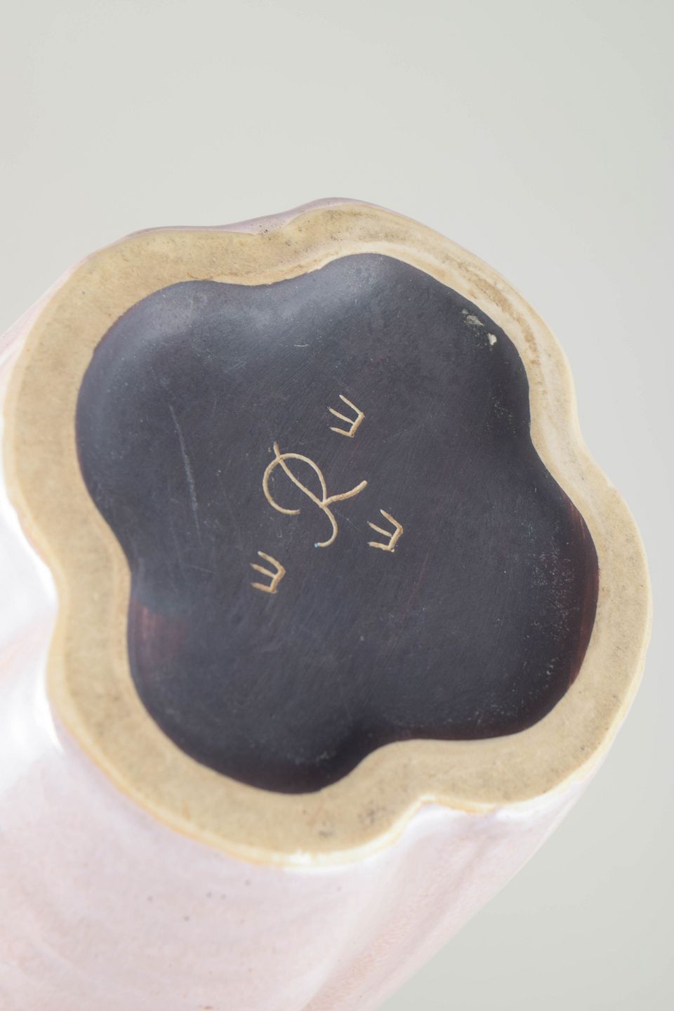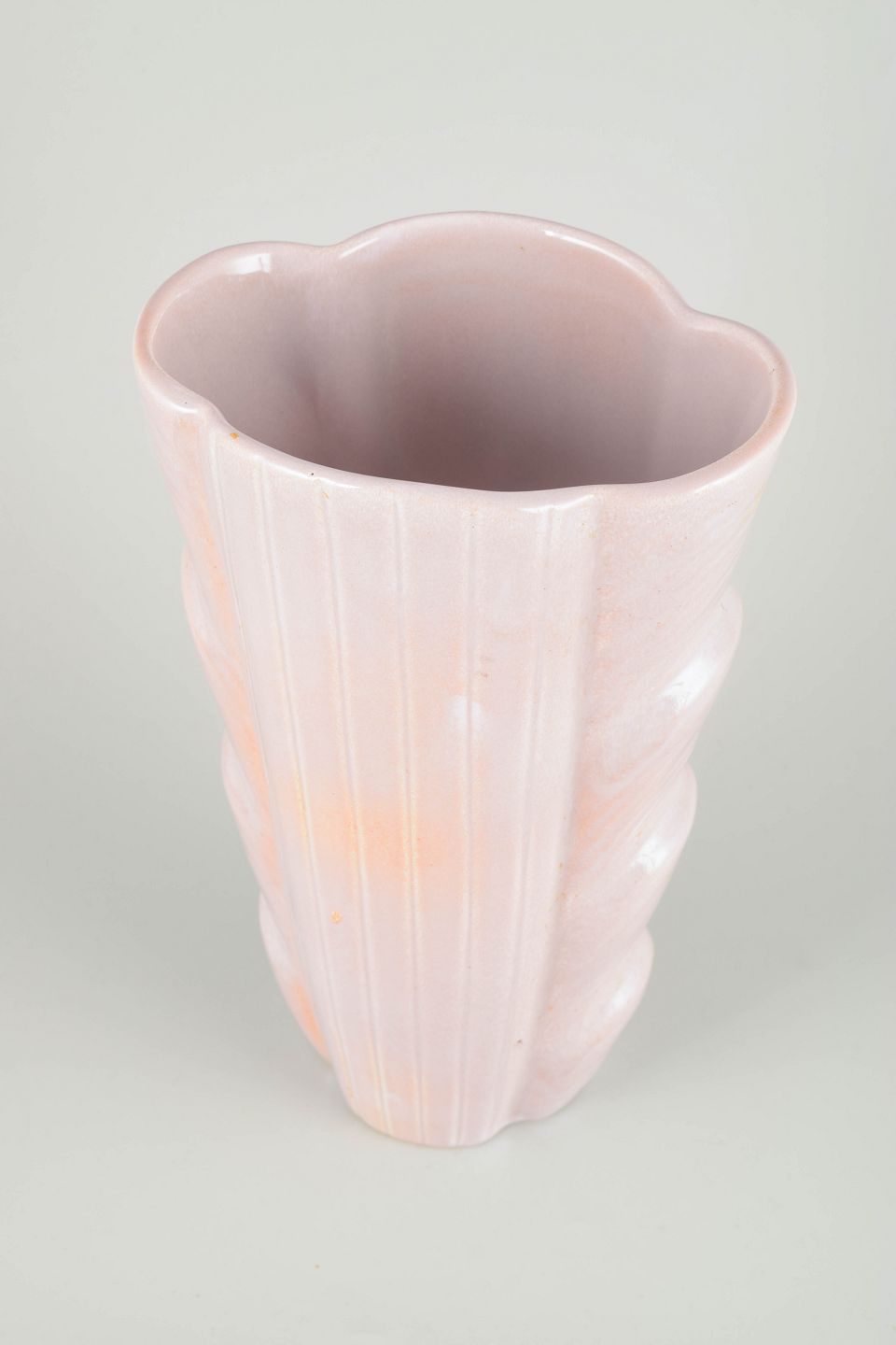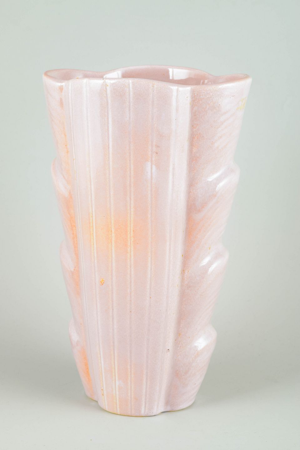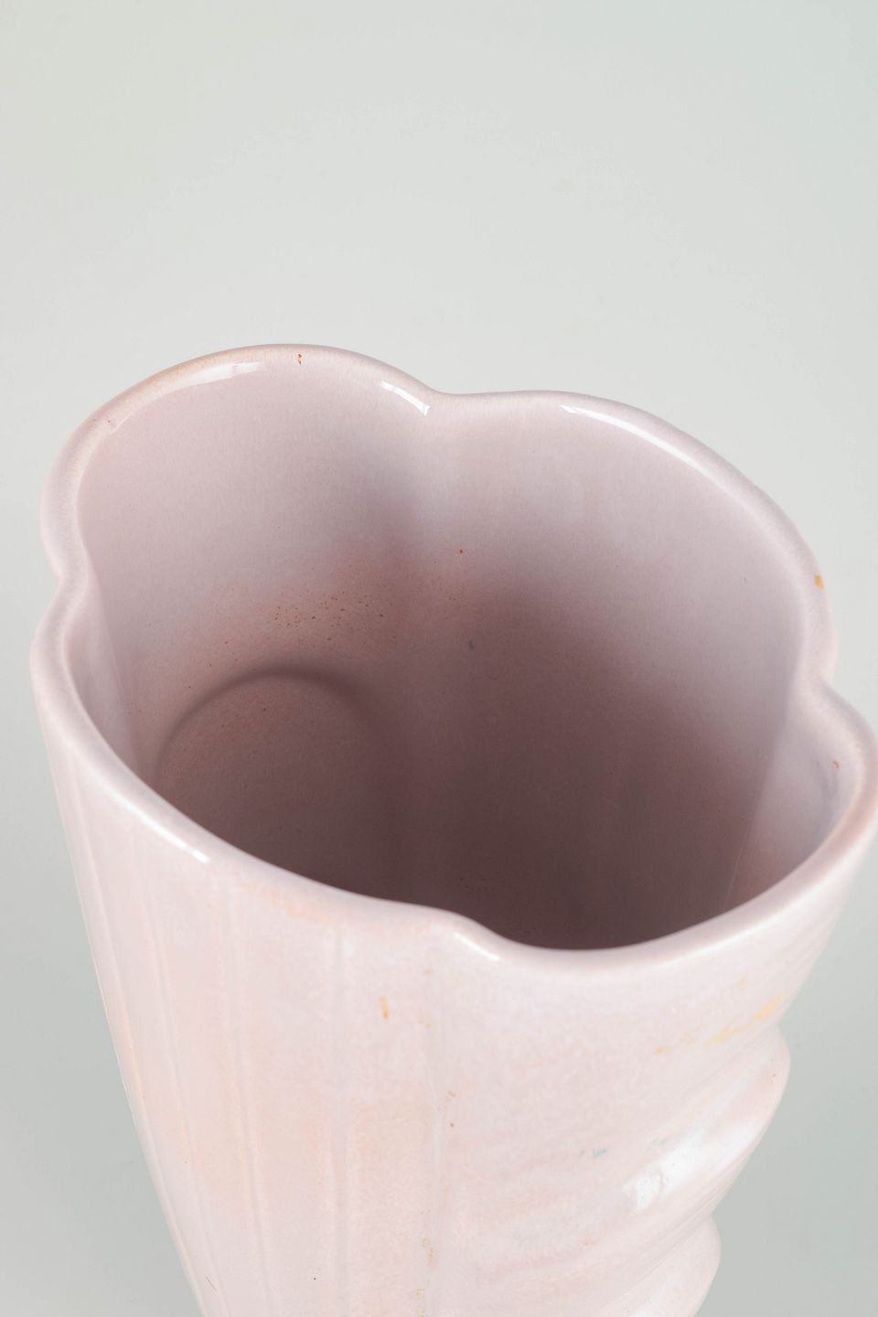Imponerende vase i glasureret keramik med blødt rosa tone og karakteristisk rillet og organisk relief-dekoration. Et elegant eksempel på Rörstrands formgivning fra midten af det 20. århundrede, hvor funktionalisme og dekorativ sans smelter sammen.