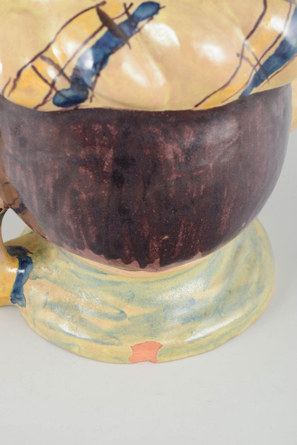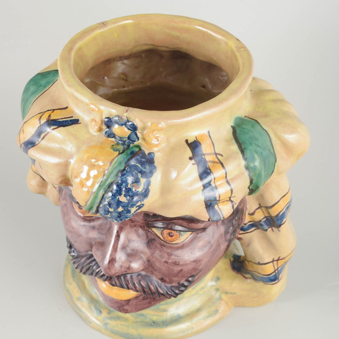 Håndlavet terrakottavase formet som et mandshoved med turban, håndmalet i stærke farver – brun, gul, grøn og blå. Et klassisk eksempel på siciliansk majolikatradition fra Caltagirone.