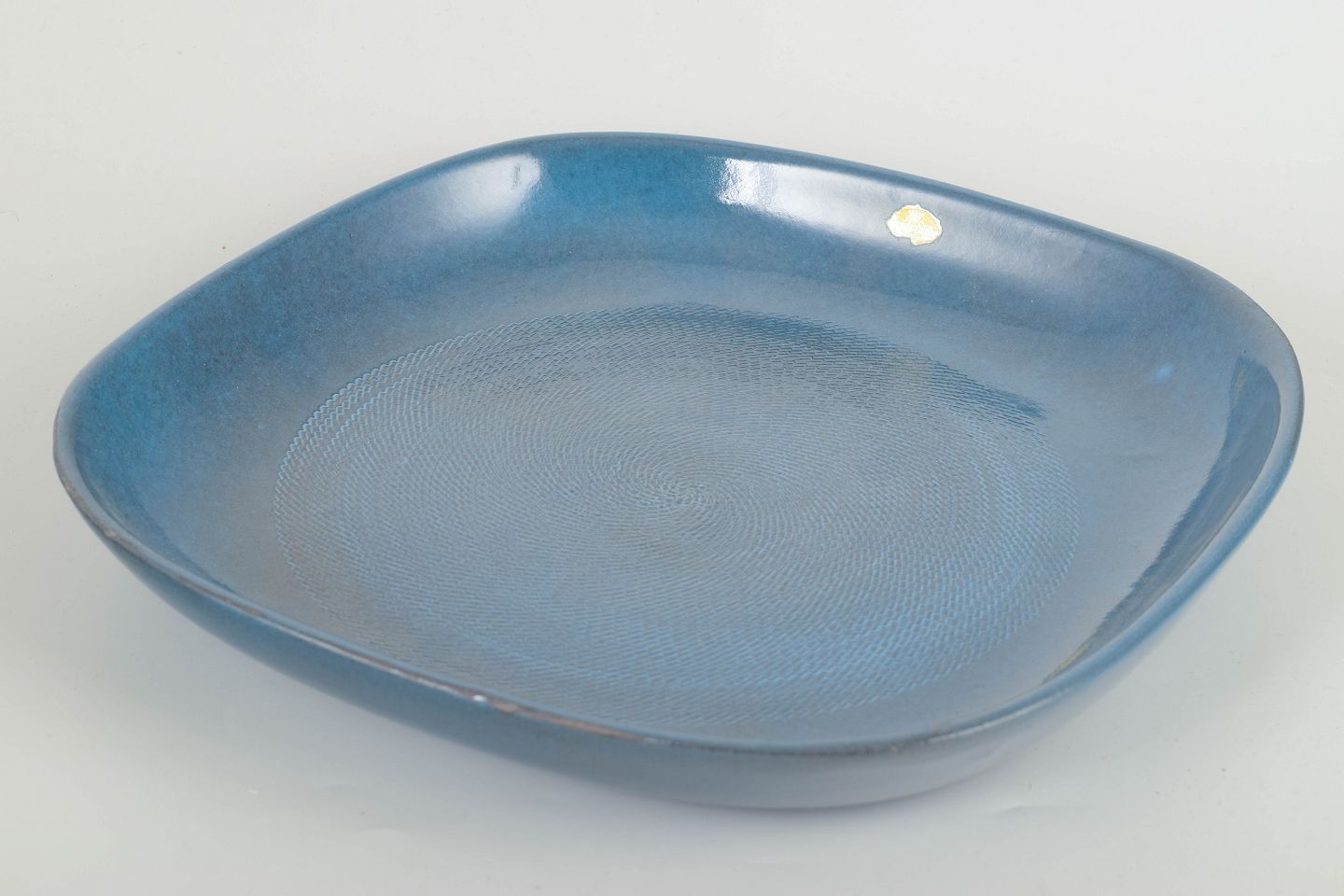 Stort kvadratisk fad i stentøj med afrundede hjørner og smuk blå glasur med spiralformet dekoration i midten. Et klassisk eksempel på Upsala Ekebys 1960’er-design, hvor funktionalitet og æstetik forenes i enkel elegance.