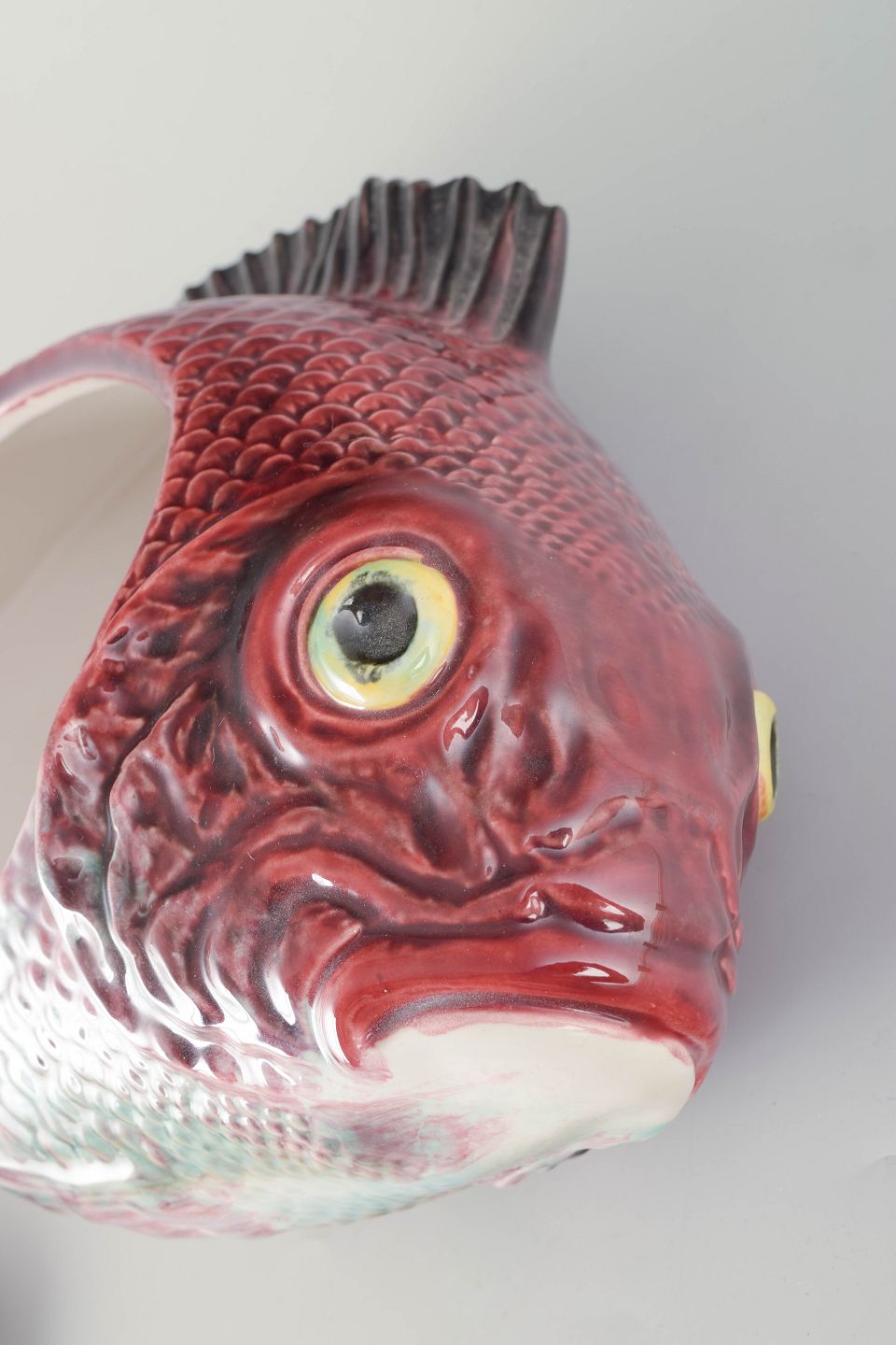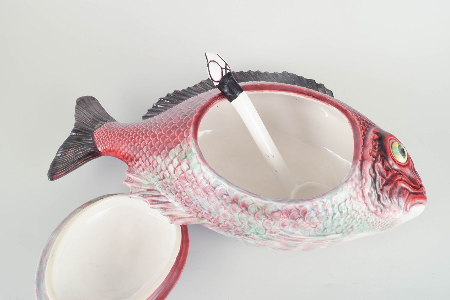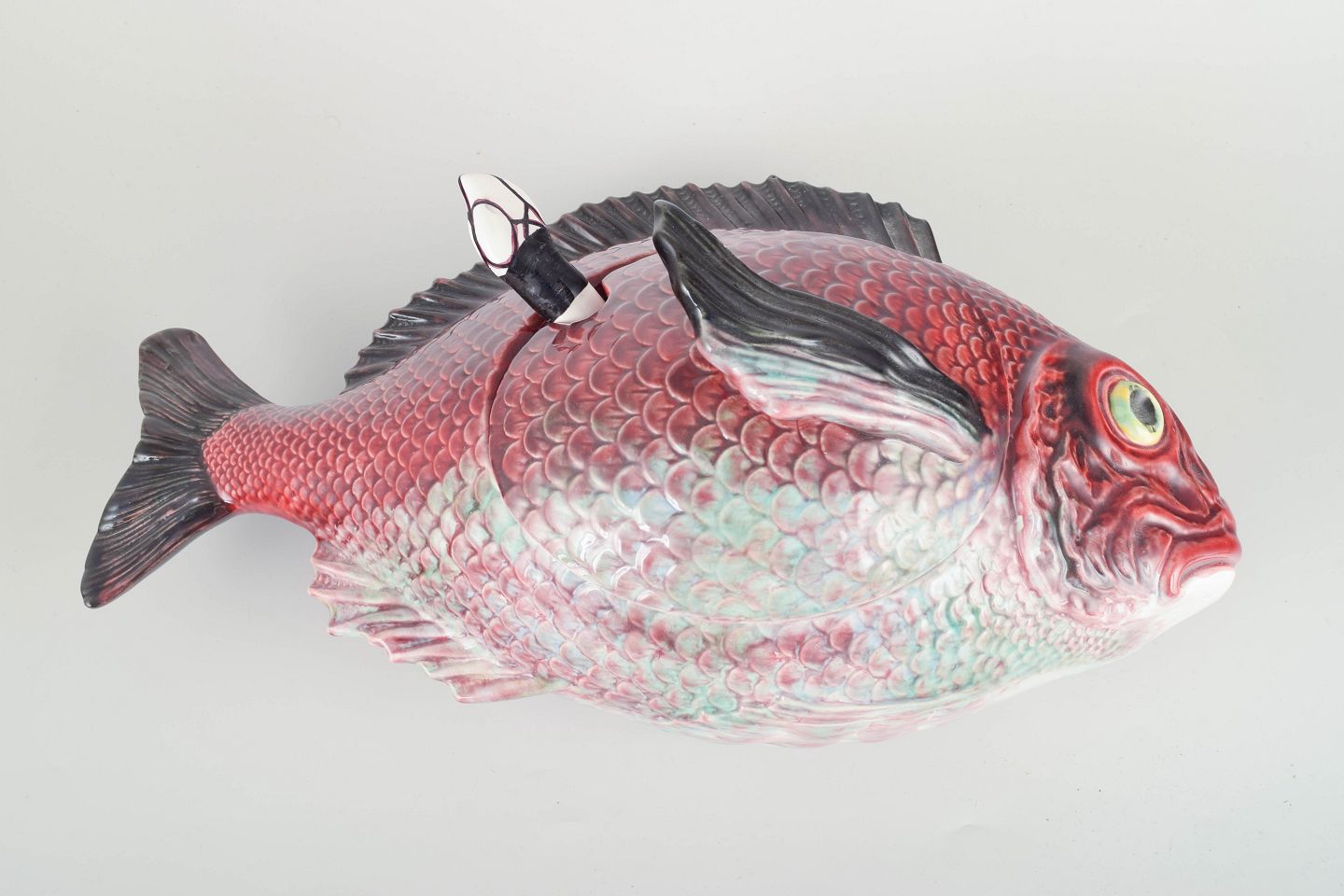 Dekorativ og humoristisk terrin formet som en fisk med låg og tilhørende ske. Håndmalet i levende nuancer af rød, grøn og grå, med fint modellerede detaljer i finner og skæl. Et karakterfuldt og sjældent serveringsstykke med både funktion og skulpturel tilstedeværelse.