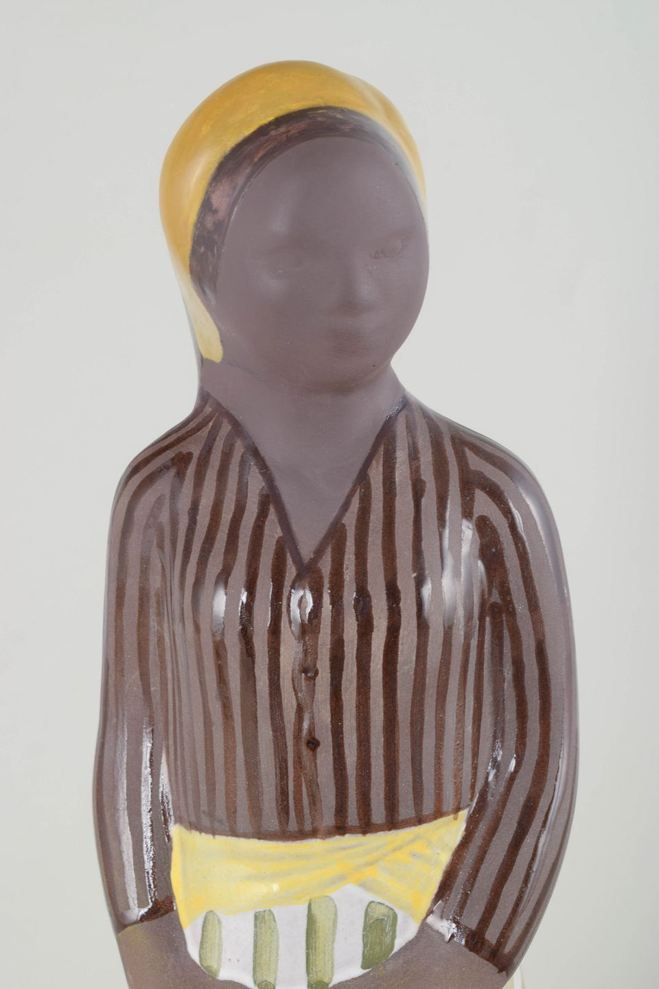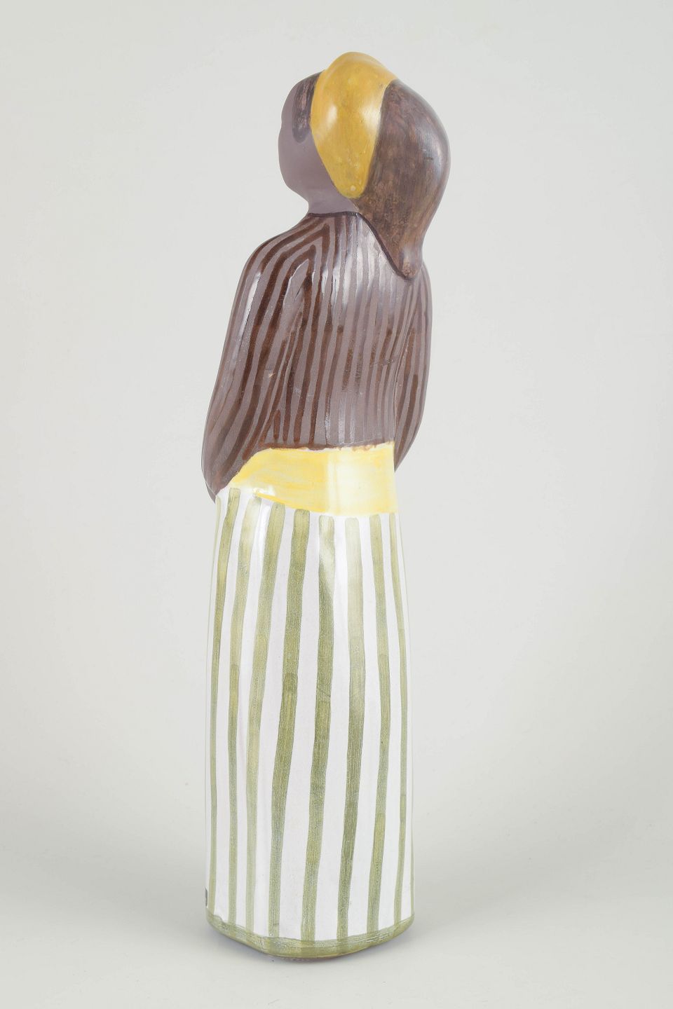Stor håndmalet keramikfigur af en stående kvinde i brunstribet bluse og grøn-hvidstribet nederdel med gult bælte. Et karakteristisk arbejde af Mari Simmulson med hendes enkle, stiliserede formsprog og rolige udtryk.