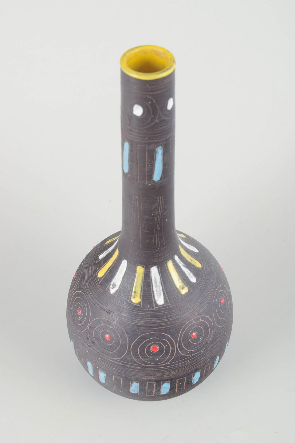 Håndmalet keramisk vase med slank hals og dekorativt geometrisk mønster i sort, blå, gul og rød. Et karakteristisk eksempel på italiensk studiokeramik fra 1960’erne med livlige farver og grafisk udtryk.