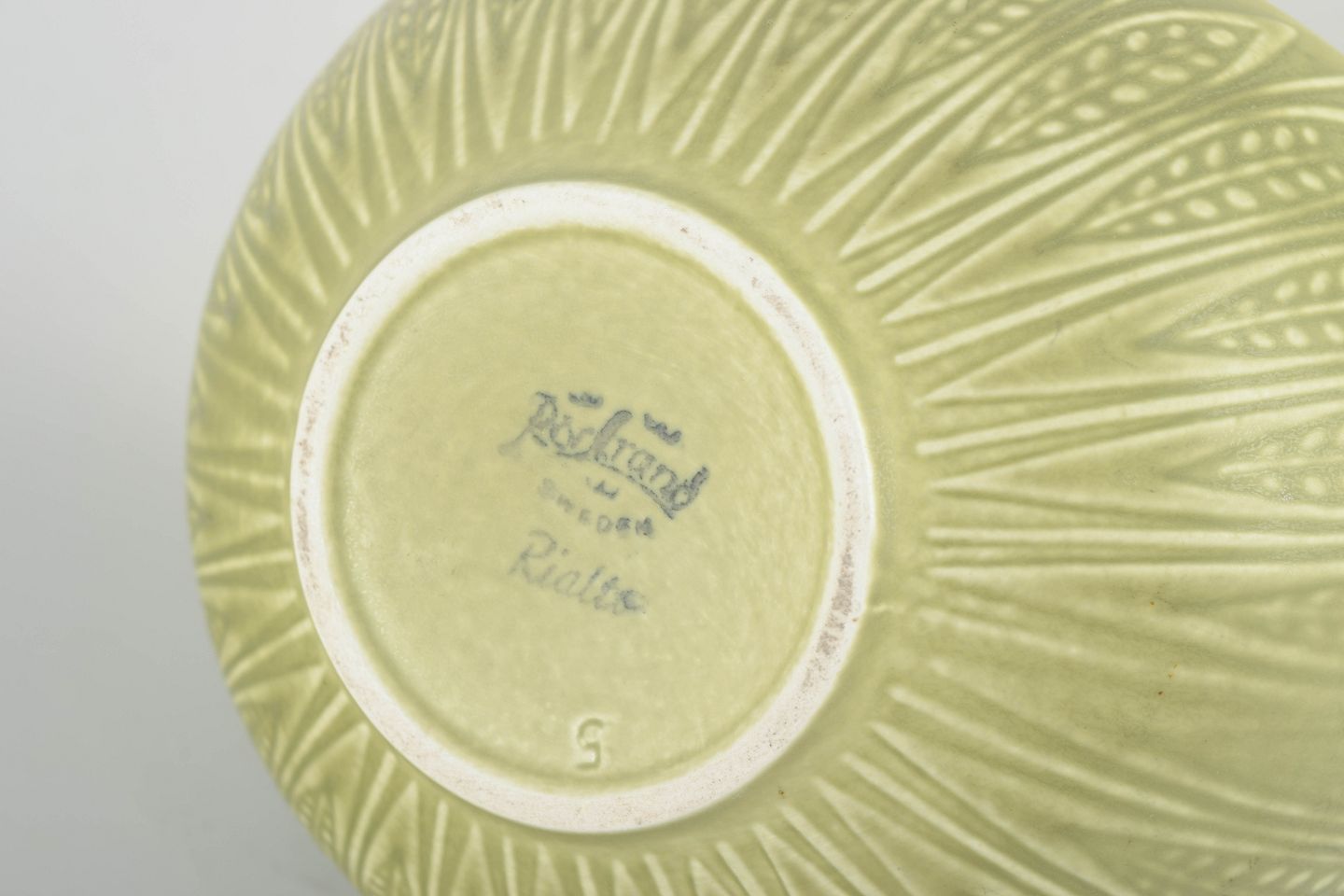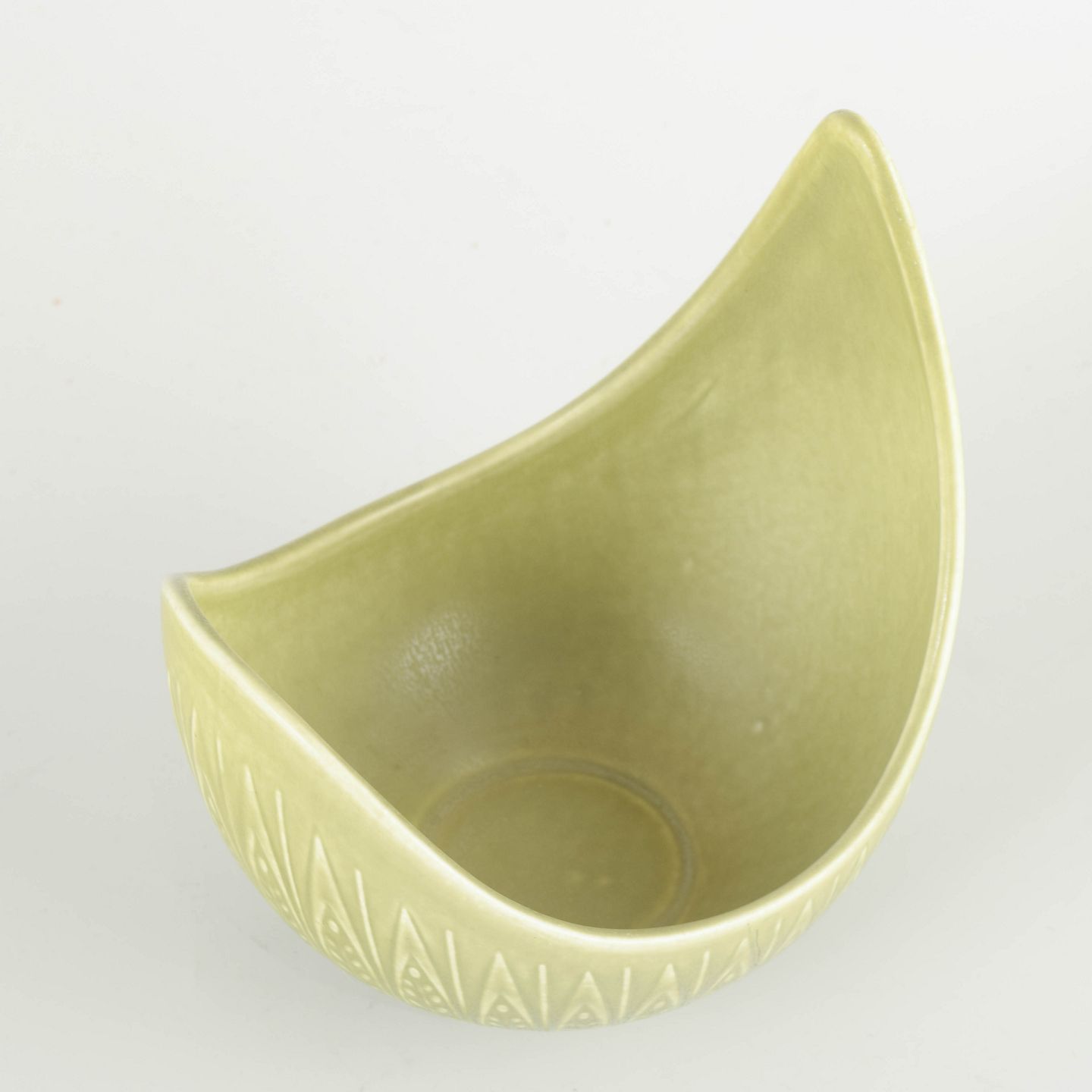 Sculpturel og organisk formet skål fra serien Rialto, med karakteristisk reliefmønster og blank olivengrøn glasur. En elegant og tidstypisk repræsentation af Rörstrands design fra midten af det 20. århundrede.