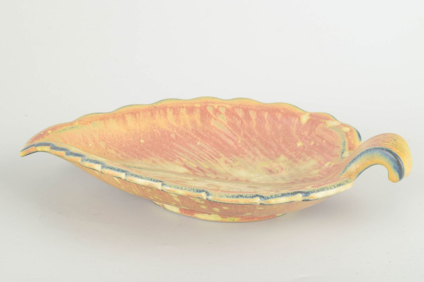 Dekorativt bladformet fad i stentøj med livlig glasur i gule, grønne og rosa nuancer. Organisk form og karakteristisk tekstur, typisk for Nylunds arbejde med naturinspirerede former og farver hos Rörstrand.