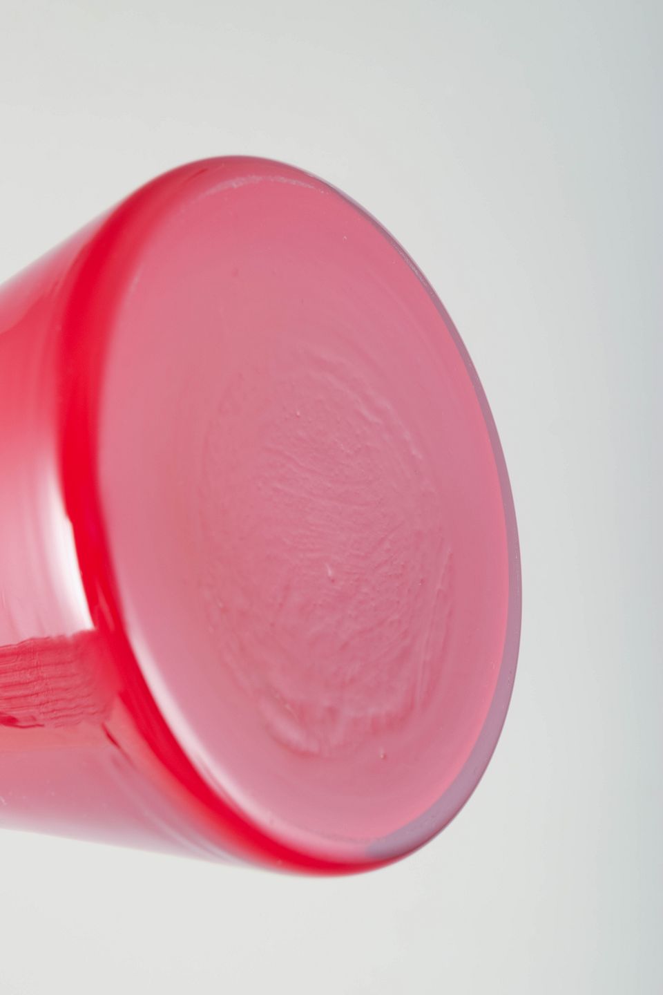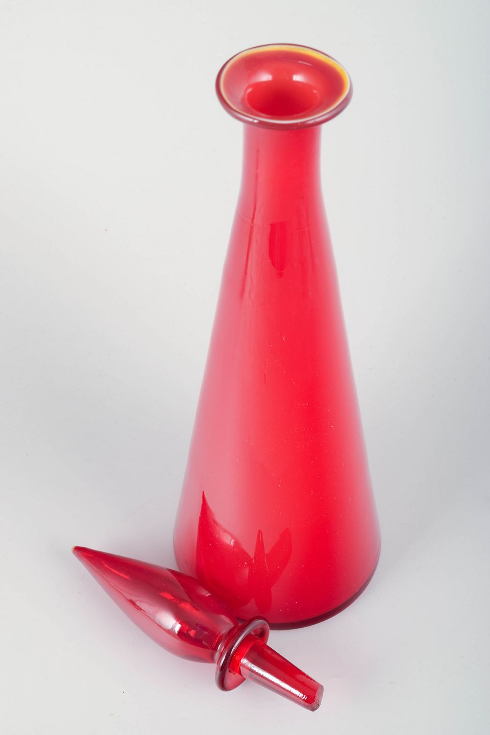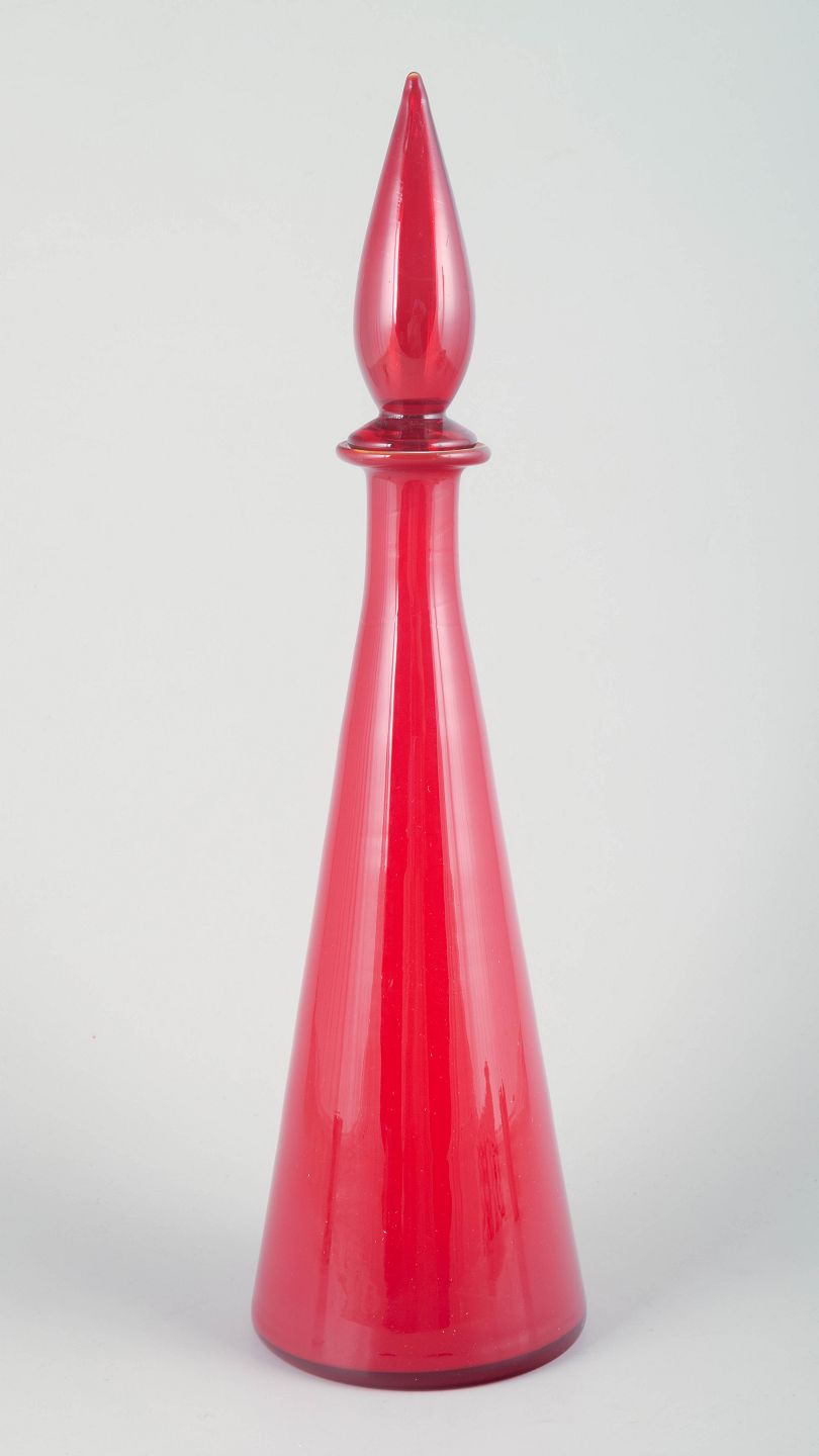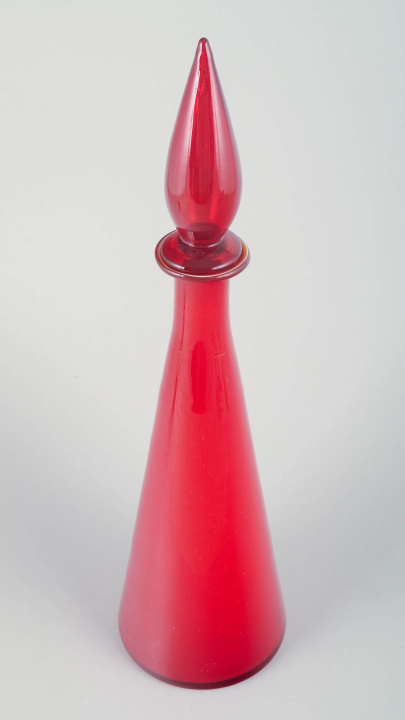 Imponerende mundblæst karaffel i kraftig rød kunstglas med slank konisk form og matchende dråbeformet prop. Et klassisk eksempel på Murano-glas fra perioden, hvor Venini excellerede i farveintensitet og elegant enkelhed.