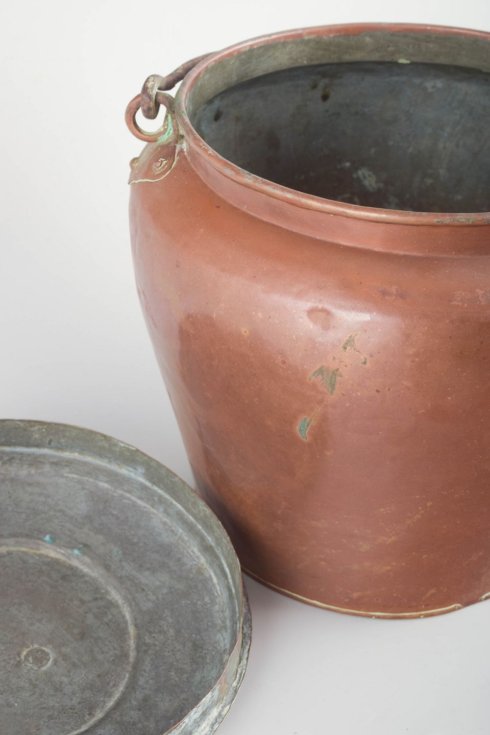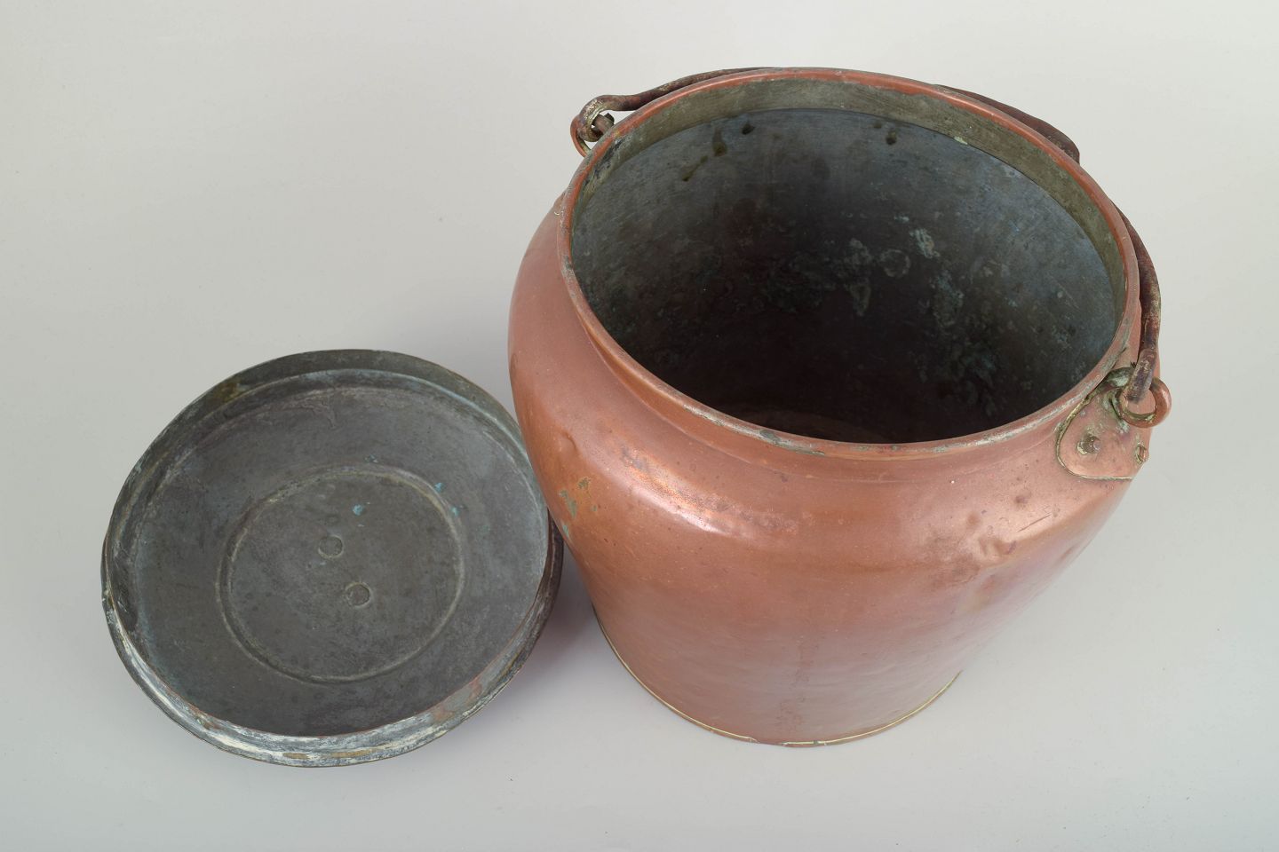 Kobber barselsspand med låg og buet hank. Traditionelt anvendt i danske husholdninger i 18–19. århundrede, ofte som barsels- eller husholdningsspand. Viser smuk, varm patina og brugsspor fra alder.