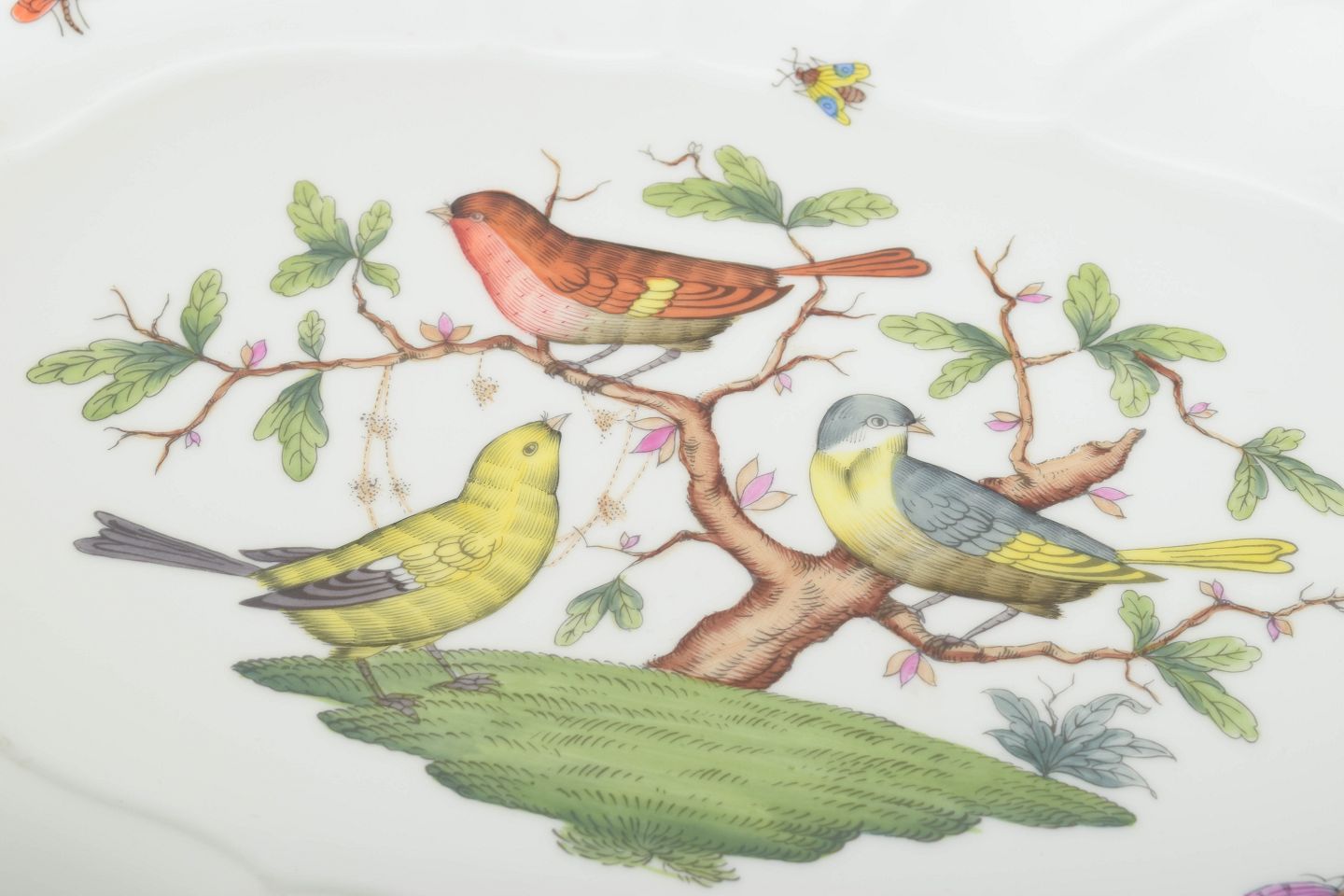 Stort ovalt serveringsfad i håndmalet porcelæn med motiv af fugle på gren og sommerfugle, kantet med forgyldt rand. Klassisk Herend-dekoration i fine farver og detaljeret penselføring.
