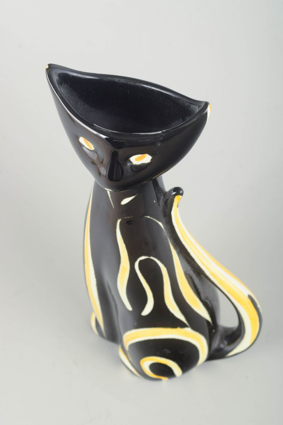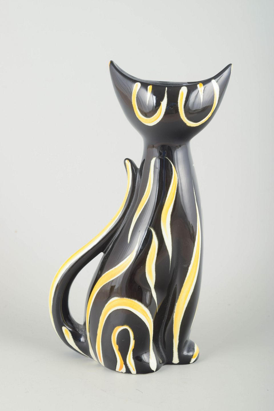 Elegant og stiliseret keramisk vase formet som en kat, i sort glasur med håndmalede gule og hvide linjer i typisk 1970’er-stil. Et dekorativt og humoristisk eksempel på tysk studiokeramik med både skulpturel og funktionel karakter.