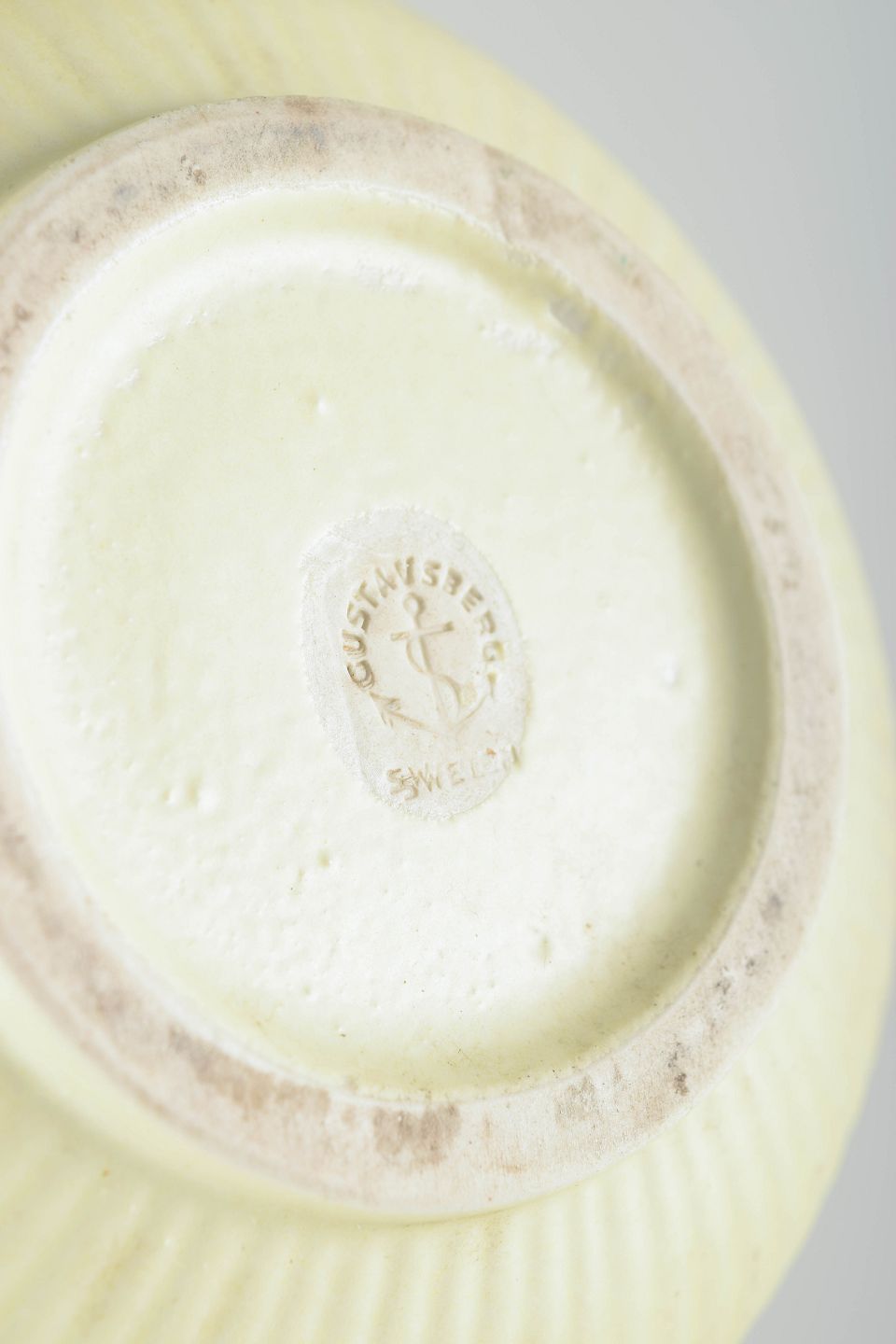Par af keramiske blomsterkrukker i den karakteristiske “Vinda”-form med let asymmetrisk, bølgende kant og rillet struktur. Glasur i blød lysegul nuance. Stemplet “Gustavsberg Sweden” under bunden.