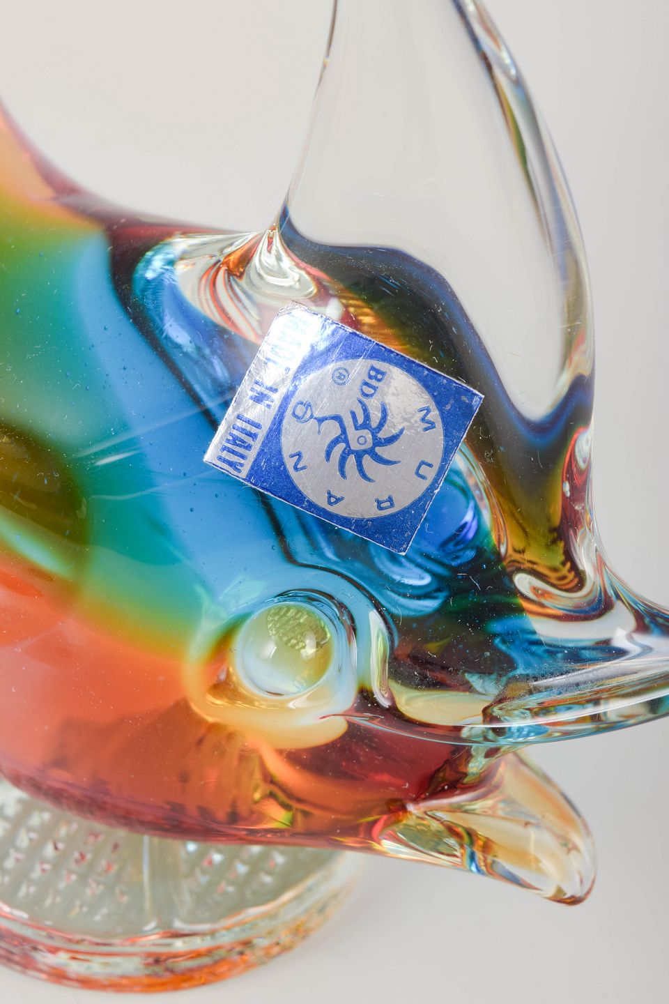 Håndlavet italiensk glasskulptur i form af en springende fisk i klart glas med flerfarvede indlagte nuancer i blå, rød, orange og grøn – et klassisk eksempel på Murano-arbejde fra perioden. Skulpturen har en elegant, dynamisk form og er udført med høj håndværksmæssig kvalitet.