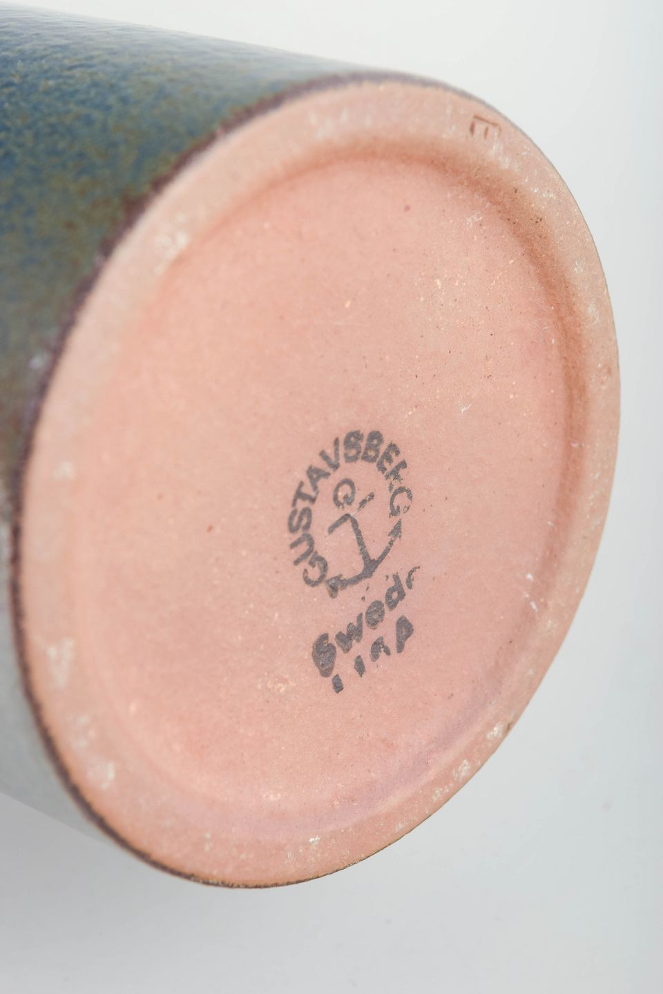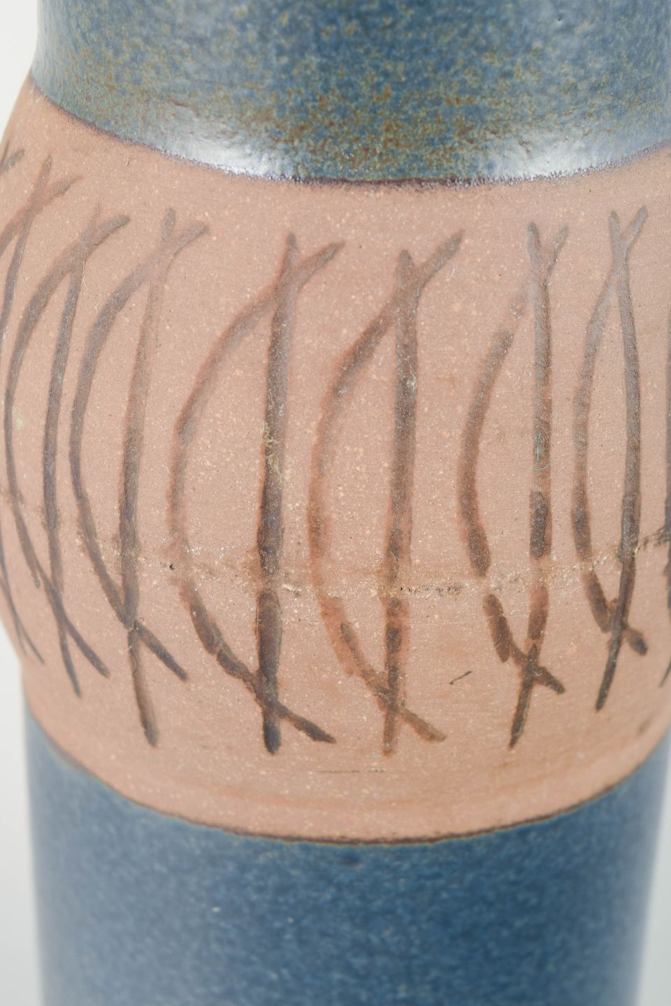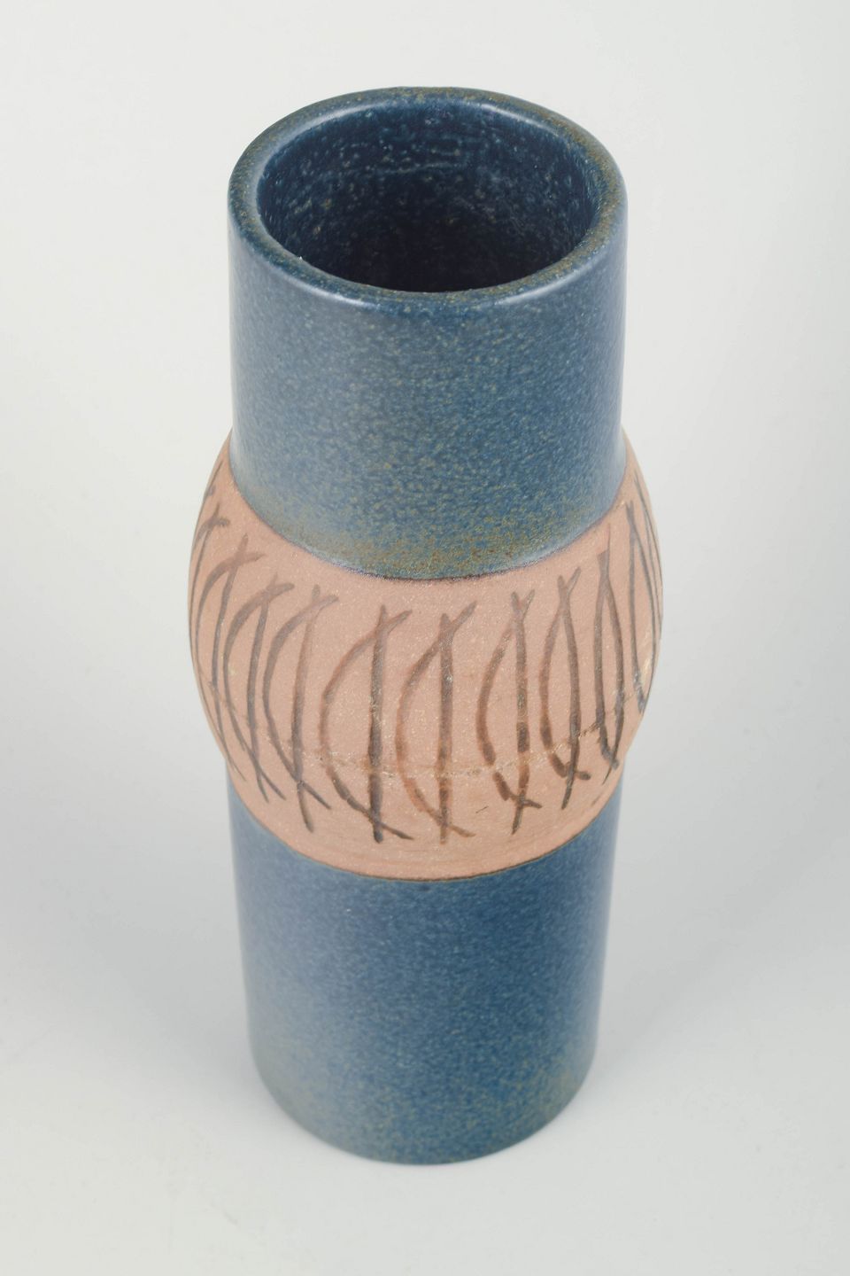 Cylindrisk stentøjsvase med indsnævret midterparti, dekoreret med håndmalet grafisk motiv i brune toner på naturligt lerfelt, flankeret af glasurerede partier i blågrå nuancer. Et fint eksempel på Larsons karakteristiske kombination af rustik enkelhed og kunstnerisk udtryk.