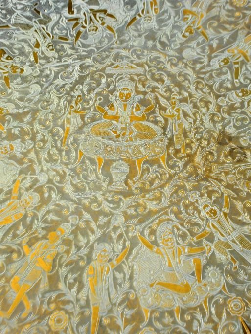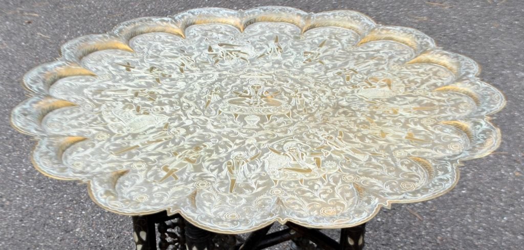 Arabischer Rauchtisch mit Messingplatte aus Indien, 19./20. Jahrhundert. Messingplatte mit Göttern verziert. Holzsockel mit Perlmutt-Intarsien. H.: 47,5 cm. Durchmesser: 77,5 cm.