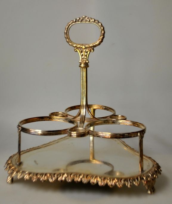 Englischer versilberter Weinhalter, 20. Jahrhundert. Dreieckige Form für drei Flaschen mit Halter. H.: 26 cm. B.: 25 cm.